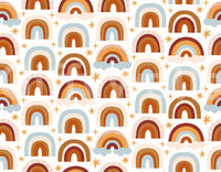 Lys op for ethvert rum med 'Happy Rainbow Hues', et muntert og levende tapet med et legende mønster af regnbuer i et spektrum af glade farver. Regnbuerne gengives i en lidt ufuldkommen, håndtegnet stil, hvilket giver dem en varm og indbydende fornemmelse. Brugen af ​​lyse appelsiner, røde, gule og blues skaber en munter og energisk atmosfære, perfekt til børneværelser, legeområder eller ethvert rum, der har brug for et løft af positiv energi. Det gentagne mønster skaber et sjovt, livligt baggrund.