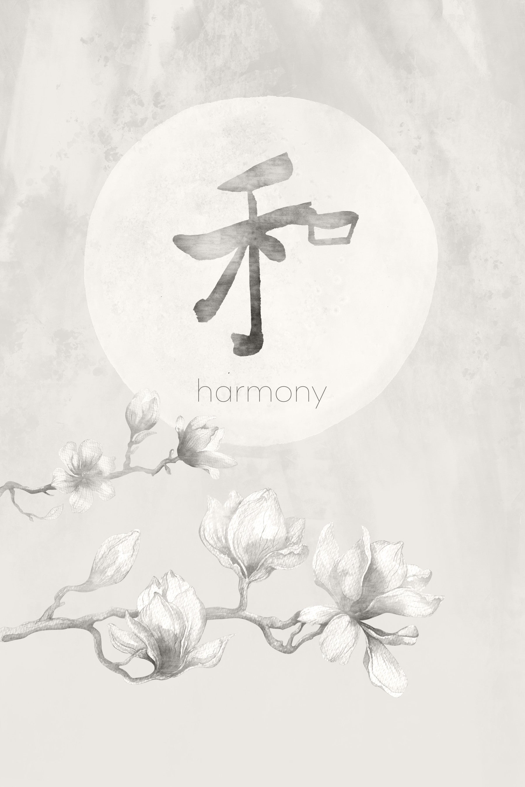 Omfavne roen i "Harmony - Japandi Style", et tapet, der problemfrit blander japansk minimalisme med skandinavisk funktionalitet. En rolig akvarelbaggrund er vært for en delikat Magnolia -gren, der symboliserer skønhed og modstandsdygtighed. Den fremtrædende Kanji -karakter, der betyder 'Harmony', styrker temaet balance og fred. De subtile strukturer og dæmpet farvepalet af bløde gråt skaber en beroligende og sofistikeret æstetisk, perfekt til at skabe et afslappende og opmærksomt rum. Dette design fremkalder en følelse af diskret elegance, ideel til at fremme en harmonisk atmosfære i ethvert rum.