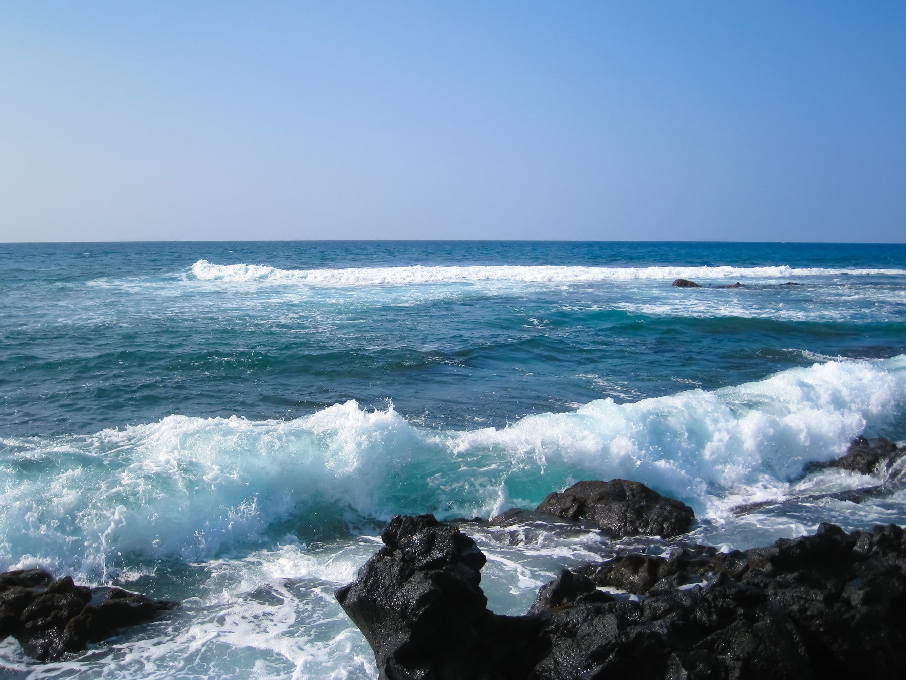 Turquoise waves crashing against volcanic rocks