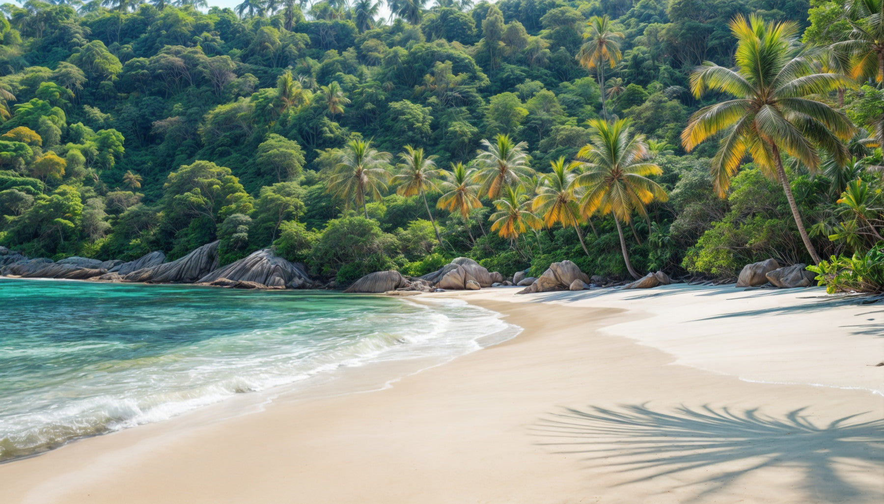 Oplev en skjult oase af ro med dette fængslende strand tapet. Billedet skildrer en afsondret bugt, hvor frodig grøn vegetation møder uberørt hvidt sand og krystalklart turkisvand. Palmer indrammer den idylliske scene, kaster deres skygger på stranden, tilføjer dybde og en følelse af sindsro. Det er en perfekt flugt for øjnene, der tilbyder en forfriskende og beroligende atmosfære til ethvert rum. Den rolige atmosfære inviterer afslapning og kontemplation.