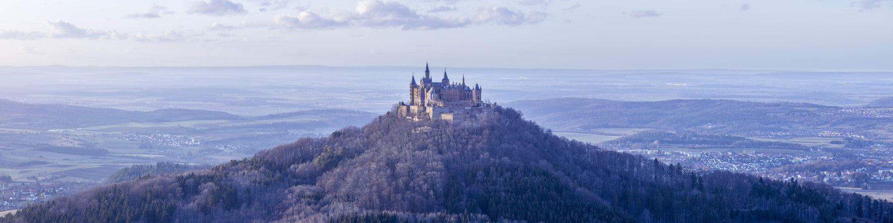Fang opmærksomheden med vægmaleriet Hohenzollern Castle, et majestætisk motiv af et af Tysklands mest ikoniske slotte beliggende på toppen af ​​et skovklædt bjerg. Vægmaleriet indfanger Hohenzollern Castles storhed, mens det hæver sig over de Schwäbiske Alper, omgivet af bølgende bakker, frodige træer og en blød, tåget horisont. Dette vægmaleri er perfekt til at tilføje en følelse af historie, mystik og ophøjelse til ethvert rum og passer til store gange, biblioteker, stuer eller temaindrettede interiører. Dets drømmeagtige, eventyrlige kvalitet forvandler vægge til portaler til en anden verden – gennemsyret af legender og elegance.