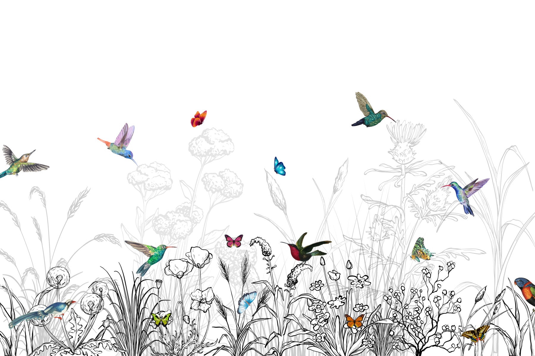 Transform din plads med dette finurlige tapet. Observer kolibrier og sommerfugle fladder blandt monokrome enge. Delikate detaljer tilbyder en blanding af naturinspireret kunst og moderne design. Ideel til at skabe en fredfyldt atmosfære i soveværelser, stuer eller planteskoler, dette tapet til vægge fungerer vidundere. Den lette og luftige palet supplerer let minimalistiske eller bohemske interiør, hvilket bringer et strejf af udendørs inde.
