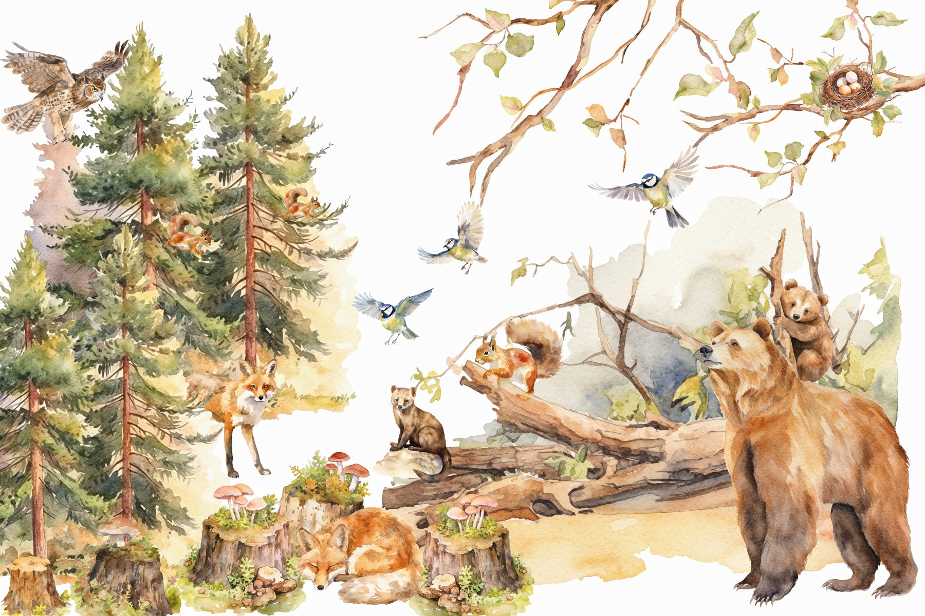 Omfavne den rolige skønhed i skoven med dette akvarel tapet. Intrikate detaljer bringer en finurlig scene med skovdyr til live til liv: en majestætisk brunbjørn med dens unger, legende ræve, travle egern og delikate blå bryster, der flitter blandt træerne. Den bløde akvarelpalet af grønne, brune og appelsiner skaber en beroligende og fredelig atmosfære, perfekt til at omdanne ethvert rum til en rolig flugt. Den håndmalte stil tilføjer et strejf af kunst og raffinement, hvilket gør dette tapet til et unikt udsagnsstykke til dit hjem.