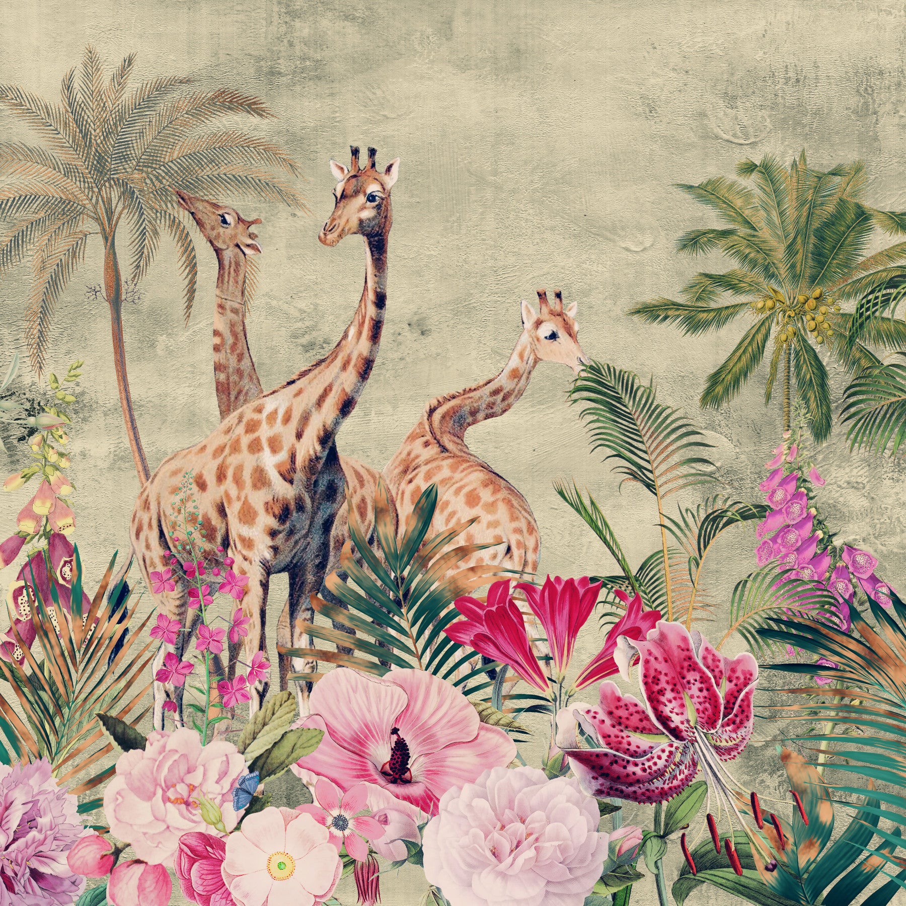 Undslippe til den rolige skønhed i den afrikanske savanne med dette udsøgte tapet. Tre giraffer, der er gengivet i en delikat akvarelstil, står majestætisk midt i en pulserende række tropiske blomster og palmer. Den bløde, dæmpede farvepalet fremkalder en følelse af rolig ro, mens de detaljerede botaniske elementer tilføjer et strejf af raffinement. Dette tapet er en perfekt blanding af naturens elegance og Afrikas vilde skønhed, ideel til at skabe en fredelig og fængslende atmosfære.