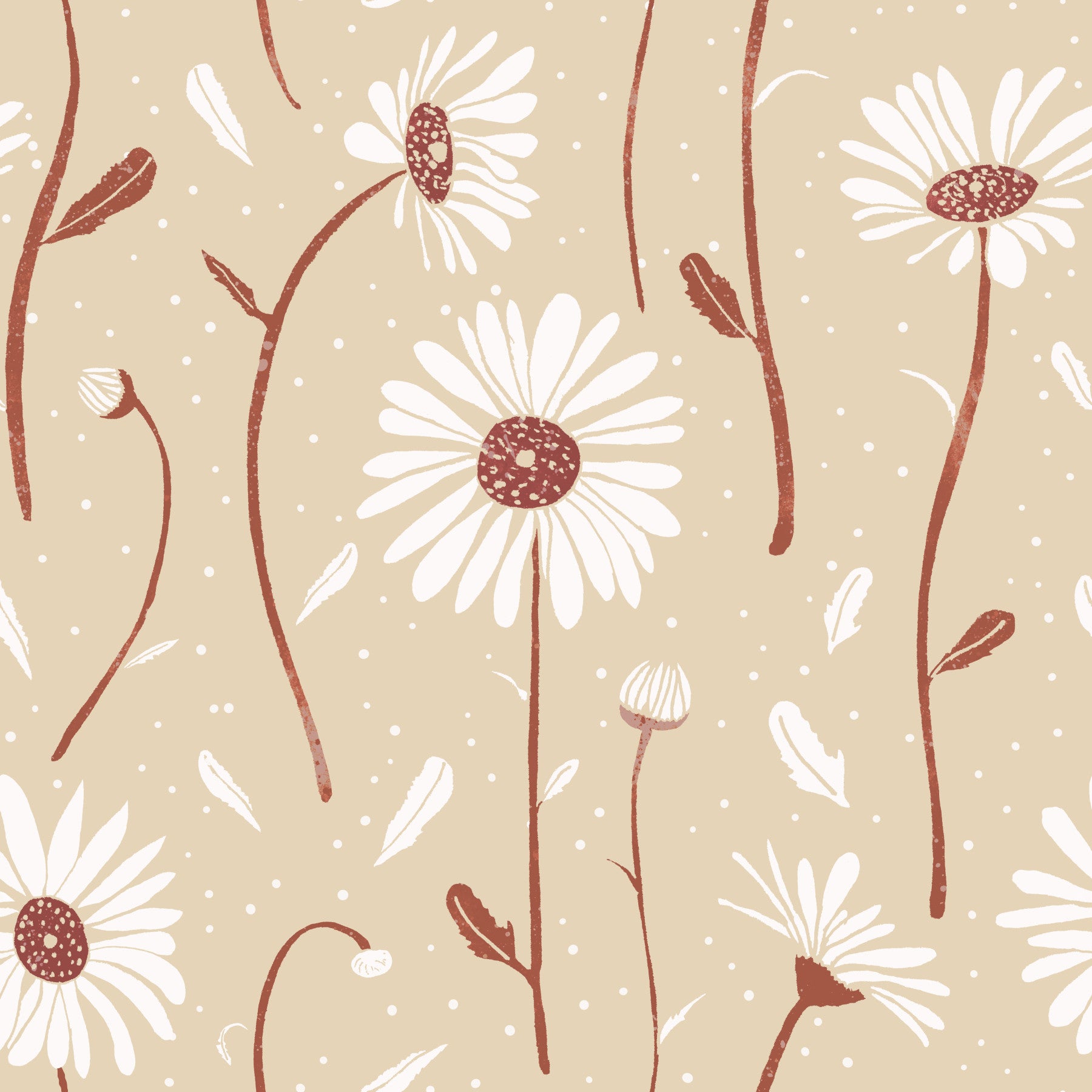 Dette tapet transporterer dig til en rustik eng badet i blødt sollys. Designet har et charmerende gentagelsesmønster af forenklede tusindfryd med terracotta -stængler og hvide kronblade, der er gengivet i en struktureret, lidt ufuldkommen stil. Små hvide prikker og blade tilføjer dybde og bevægelse, hvilket skaber en subtil, luftig fornemmelse. Den jordagtige farvepalet af beige og terracotta er både beroligende og indbydende, perfekt til at tilføje et strejf af naturinspireret charme til ethvert rum. Ideel til dem, der søger en fredelig, organisk æstetik.