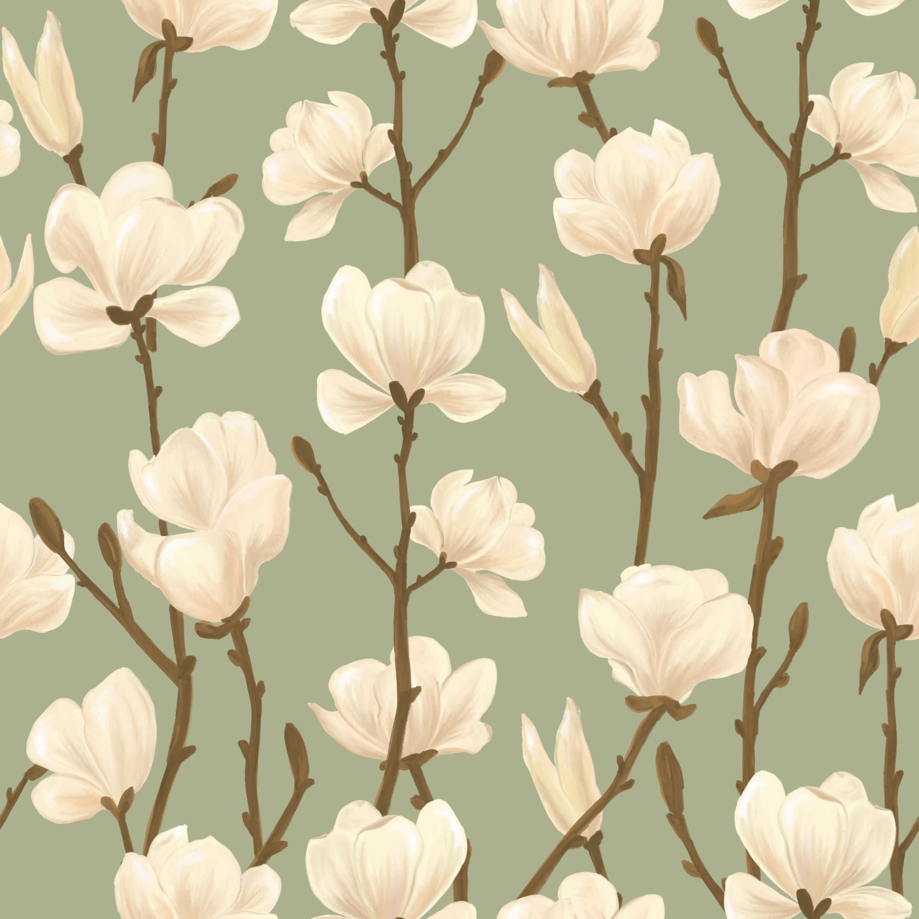 Soft green floral wallpaper with magnolia illustrations