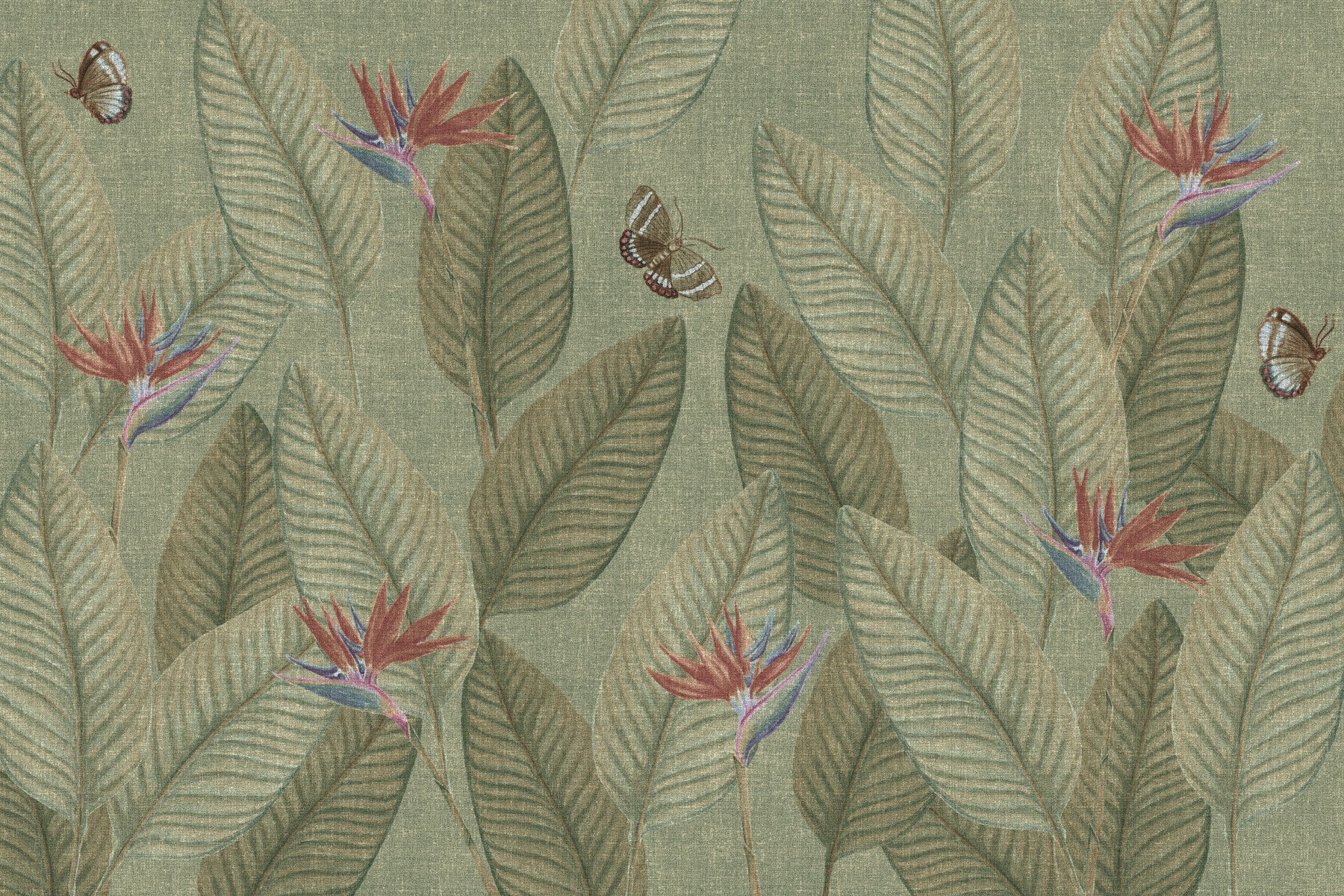 Step back in time with "Jungle Life Antique," a wallpaper that evokes the charm and mystery of a bygone era's fascination with the tropics. This design features lush, stylized leaves rendered in muted, earthy tones against a textured backdrop, lending a vintage and sophisticated feel to any space. Delicate butterflies flit amongst vibrant Bird of Paradise flowers, adding a touch of whimsical elegance. The aged aesthetic creates a serene and calming atmosphere, perfect for bedrooms, living rooms, or studies. Transform your walls into a canvas of timeless beauty and immerse yourself in the tranquil allure of a forgotten jungle paradise with this unique and captivating wallpaper, seamlessly blending nature's beauty with vintage charm.
