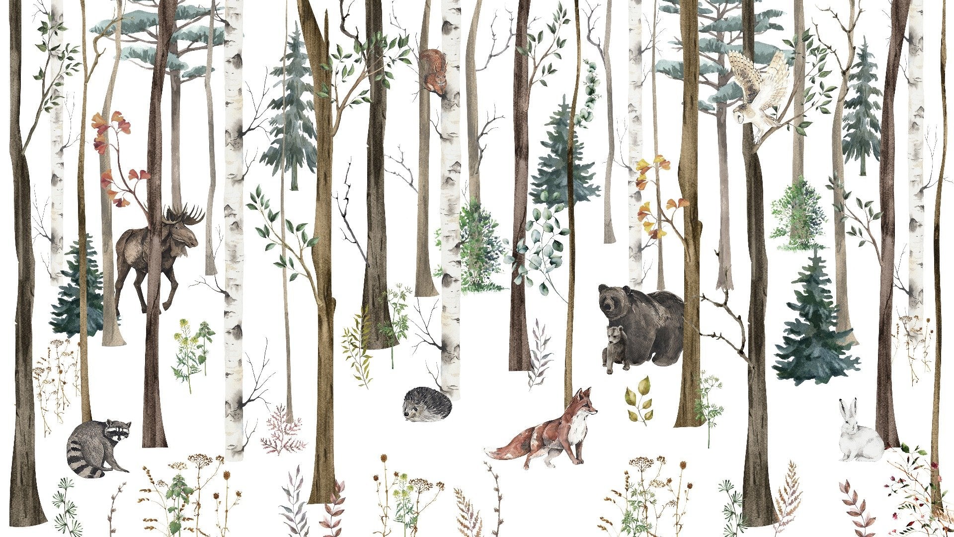 Lys dit barns soveværelse op med vores fængslende ræve- og bjørnesne skov tapet Vægmaleri. Dette fortryllende design forestiller en fredfyldt snedækket skov, der er hjemsted for legesyge ræve, bjørne og andre skovdyr. Hvert slanke fyrretræ er omhyggeligt malet, hvilket skaber en følelse af undren og eventyr. Tilstedeværelsen af ​​dyr som rensdyr, vildkatte og bjørne tilføjer et strejf af vildmarkscharme, hvilket gør det til en perfekt baggrund for historiefortælling og fantasifuld leg.