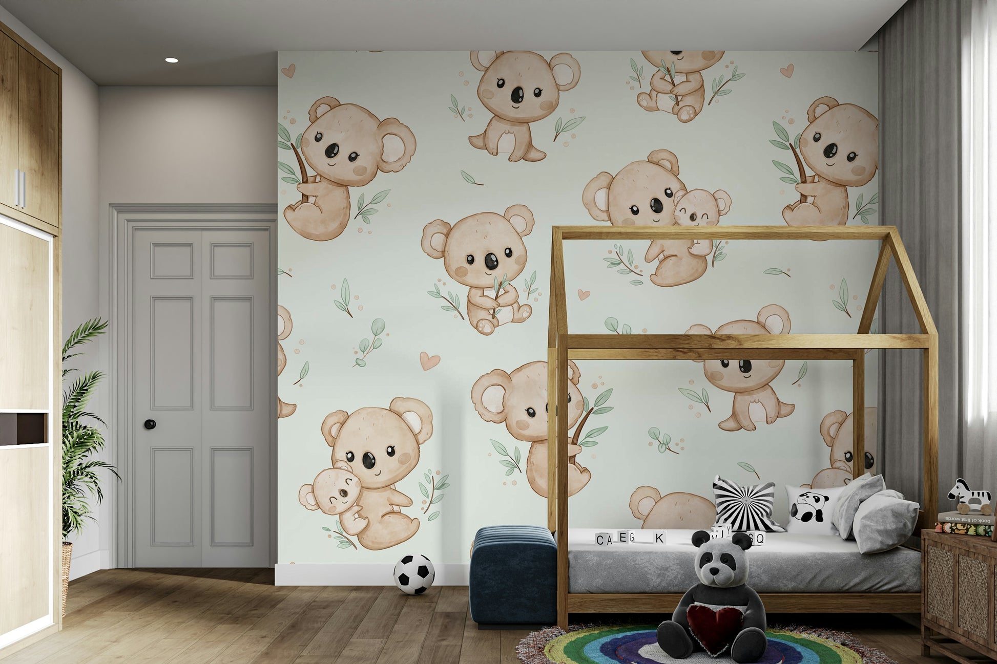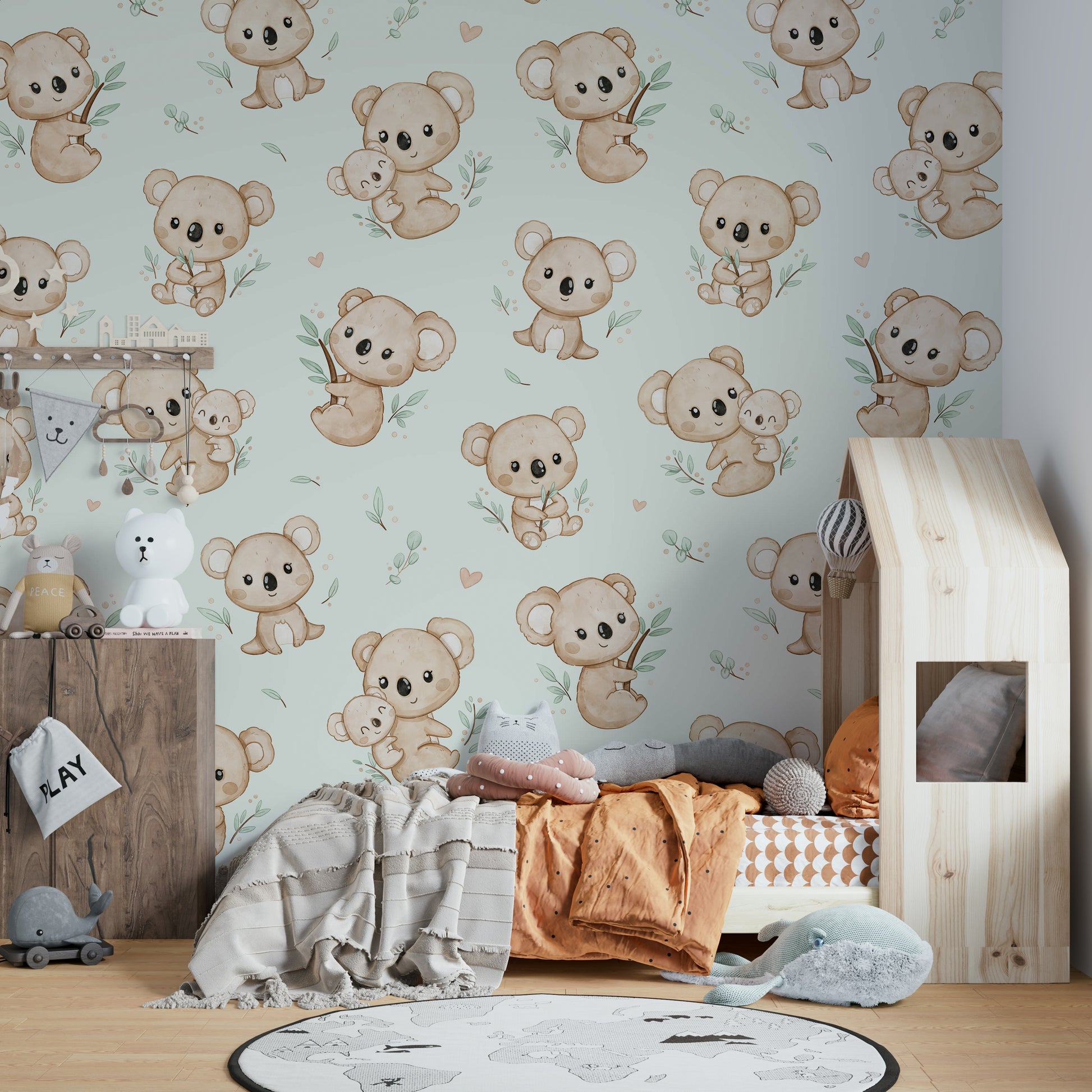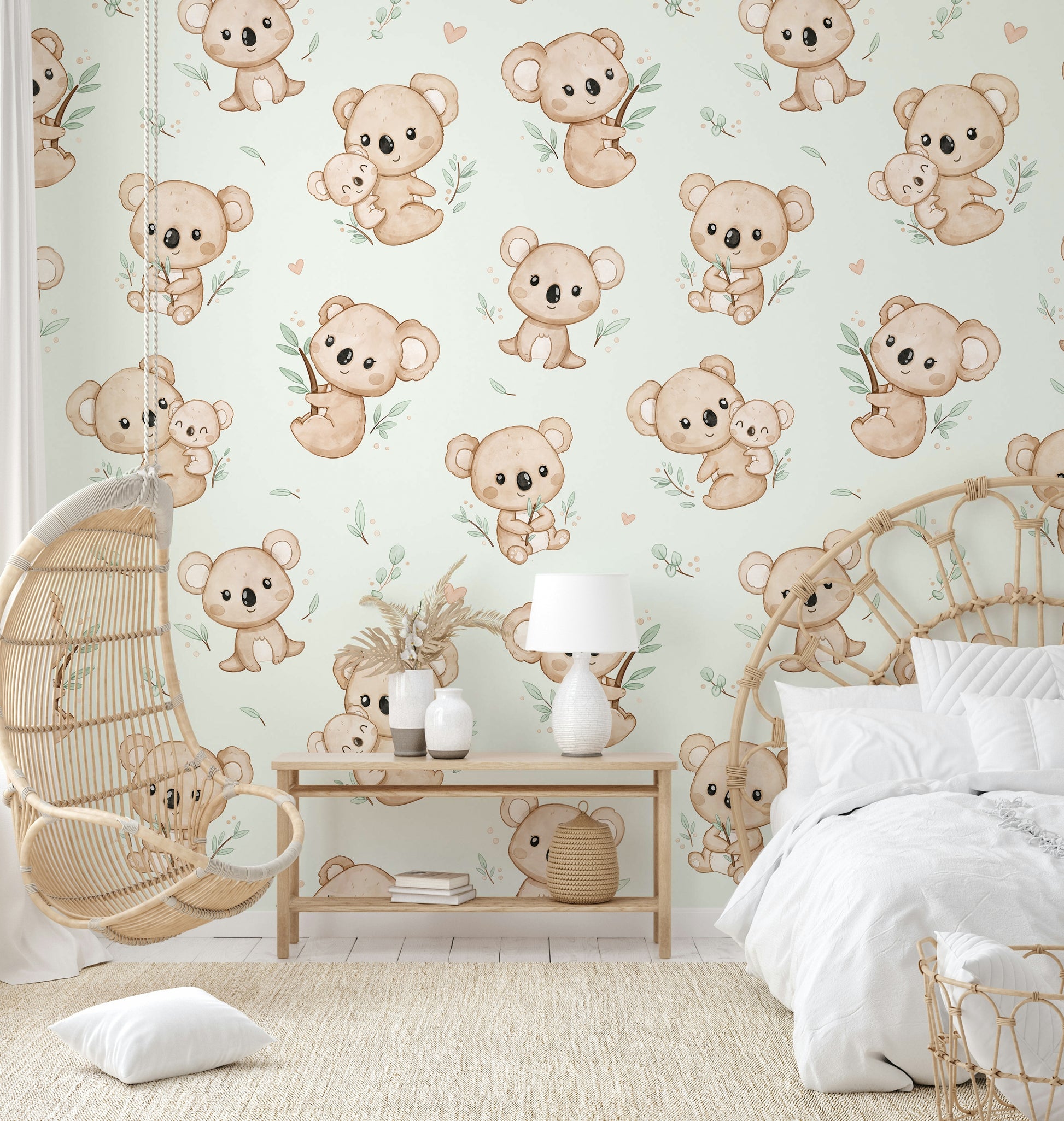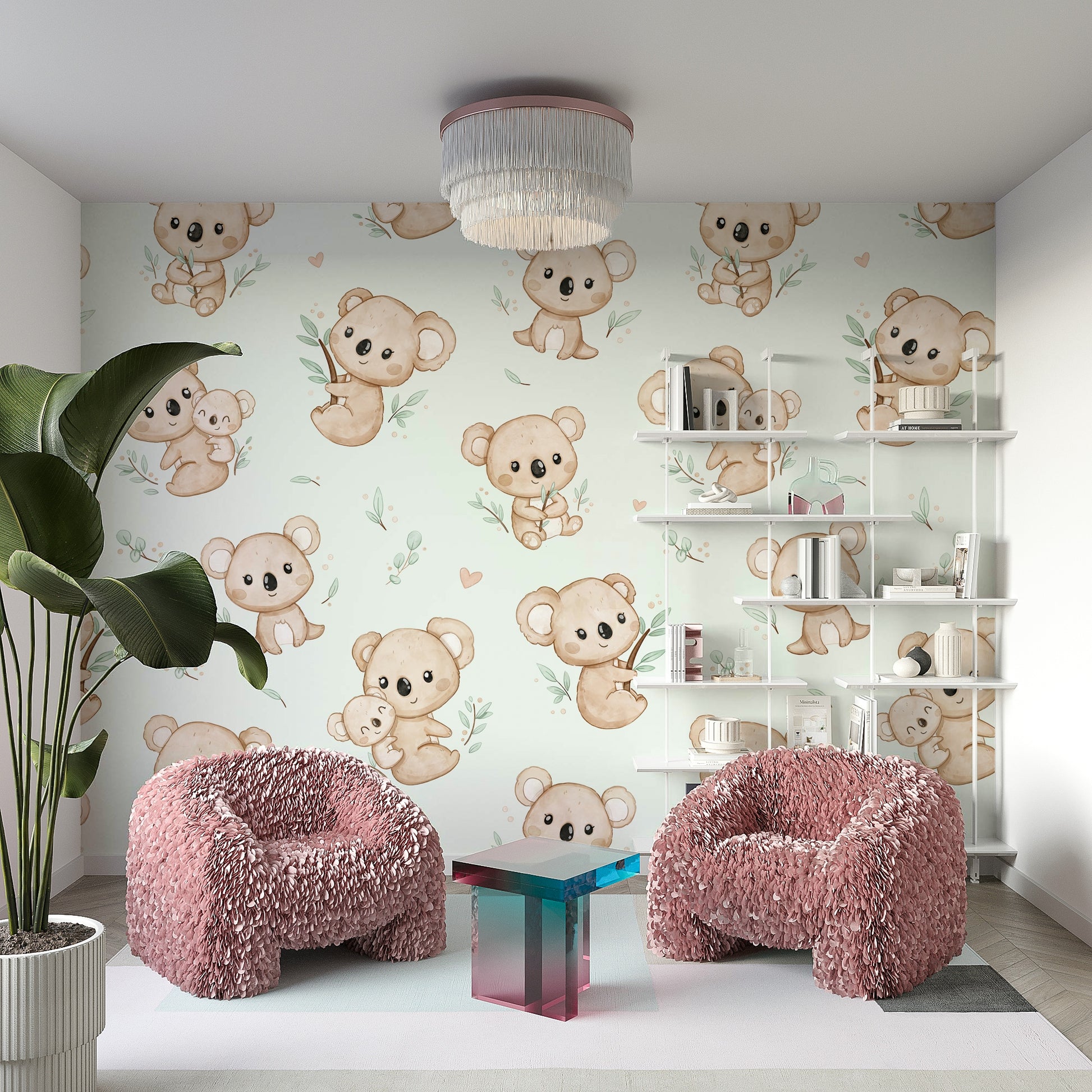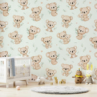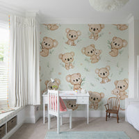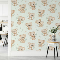 Bring et strejf af charme og glæde ind i dit hjem med dette dejlige tapetdesign med yndig koalas. Myntbaggrund tilføjer en forfriskende og beroligende stemning, perfekt til ethvert rum. Ideel til planteskoler, soveværelser eller et legende boligareal bringer disse kosede koalas varme og karakter til dine vægge. Uanset om du skaber et sjovt barns værelse eller tilføjer et finurligt touch til din indretning, er dette design helt sikkert med at inspirere smil og genoplive dit rum med det søde, naturinspirerede tema.
