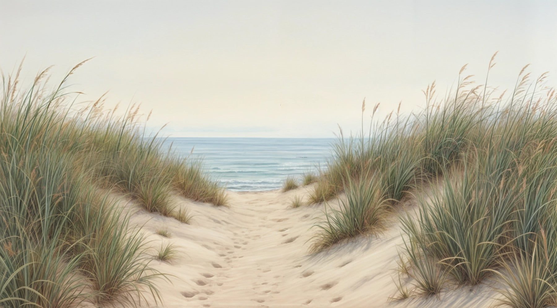 Denne rolige strand tapet fanger den rolige essens i et kystlandskab. En sti snor sig gennem bløde, sandede klitter, flankeret af forsigtigt svingende strandgræs. De dæmpede farver på sandet, græsset og et fjernt hav skaber en beroligende atmosfære, perfekt til afslapning og kontemplation. De subtile detaljer, fra fodaftryk i sandet til græssets sarte bevægelse, fremkalder en følelse af fred og stille. Dette tapet bringer de beroligende lyde fra havet og den blide brise til ethvert rum og omdanner det til en personlig helligdom af kystcharm.