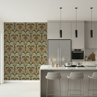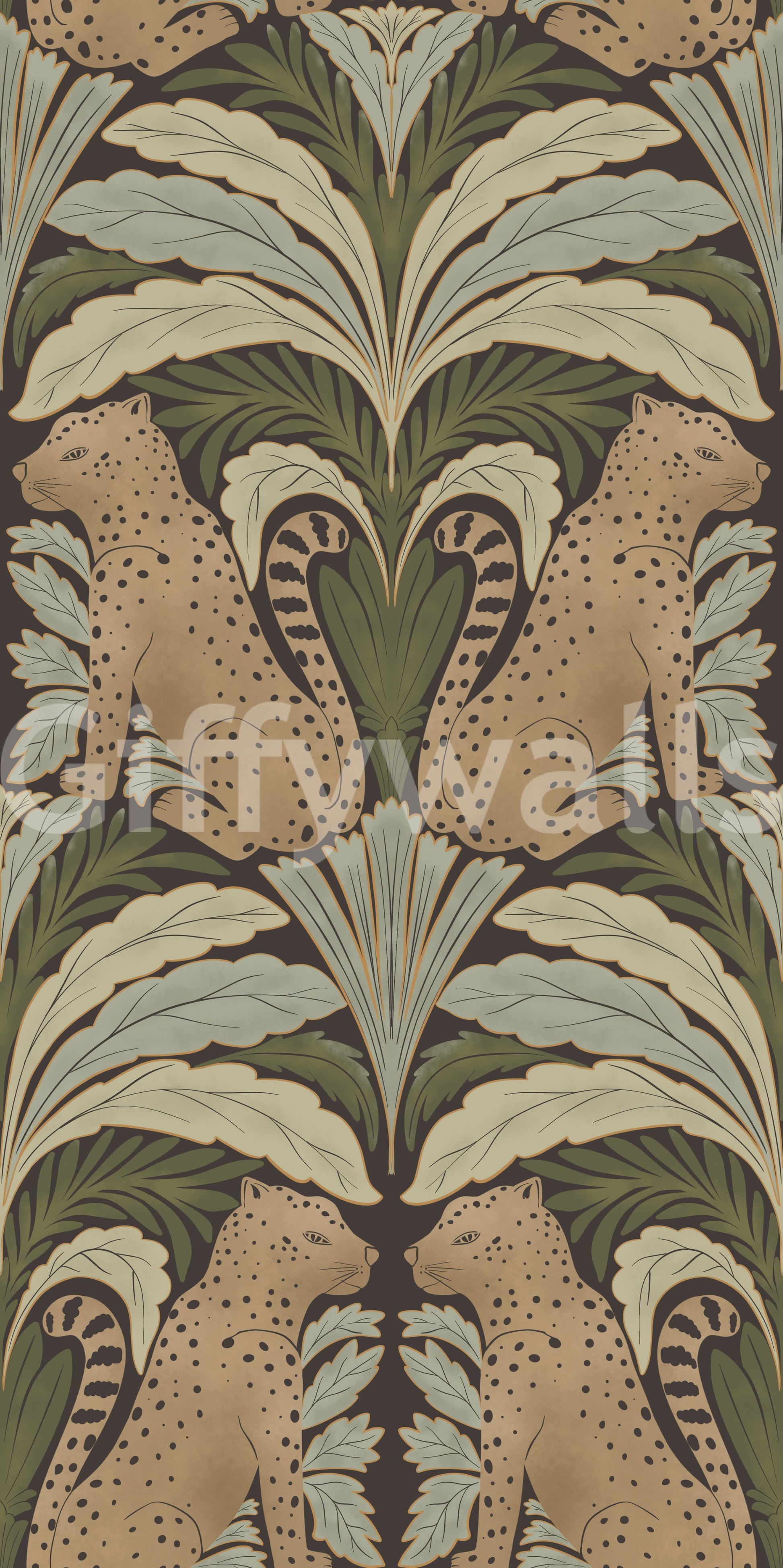 Transform your space with this visually captivating wallpaper featuring leopards nestled within a lush, symmetrical array of botanical art. The earthy palette of browns, greens, and beiges creates a calming yet luxurious atmosphere. Ideal for a living room, bedroom, or hallway, this wallpaper brings a touch of the exotic into your home while maintaining a sophisticated and balanced aesthetic. The classic design is perfect for adding depth and character to any room.