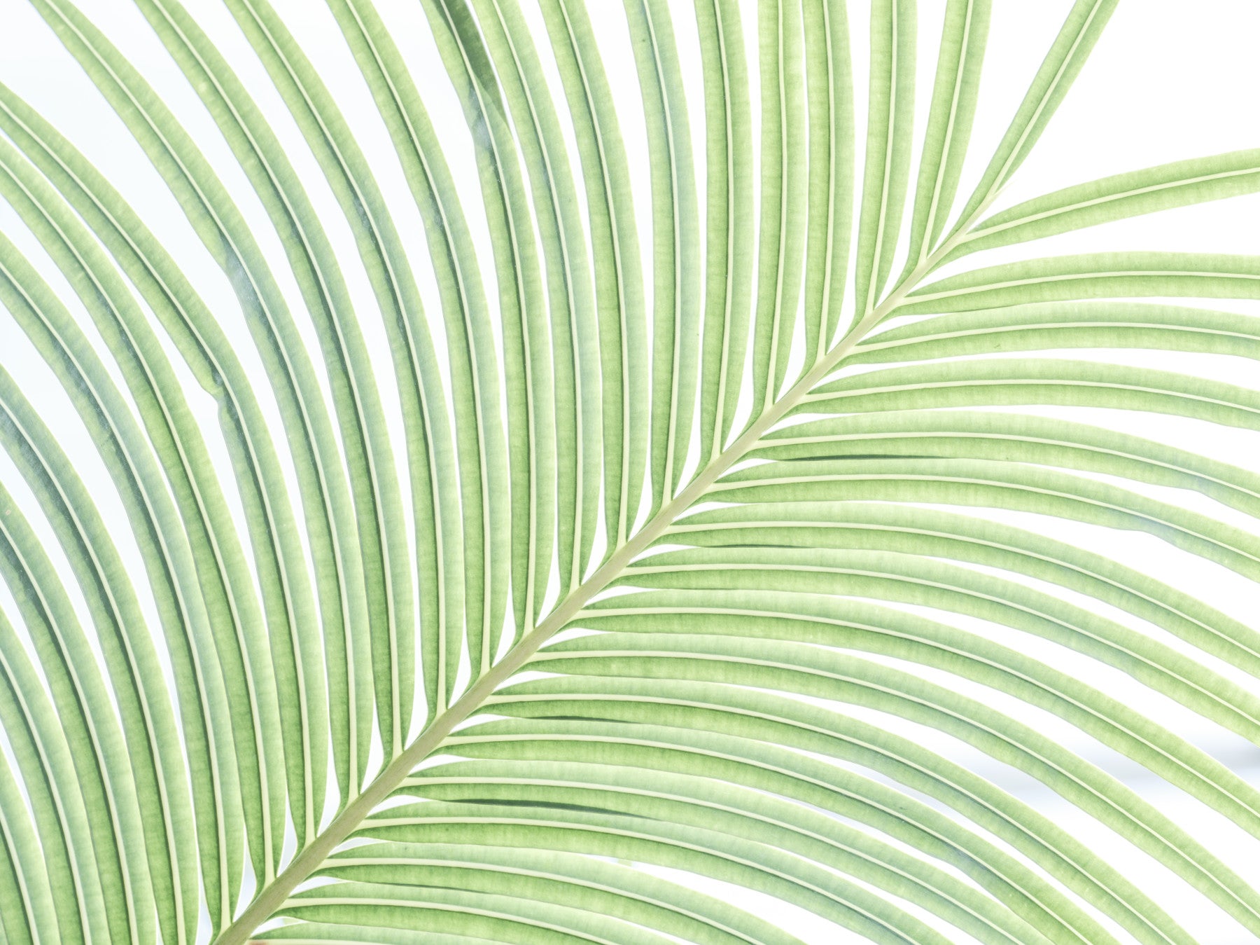 Palm leaf close-up. Bring a touch of the tropics indoors with this refreshing wallpaper for walls. The close-up of a palm leaf showcases soft green hues that evoke a sense of calm and relaxation. The design creates a simple yet sophisticated backdrop, making it a versatile choice for a living room, bedroom, or even a bathroom. It provides a neutral canvas that pairs well with various furniture styles and brightens up any room with its light, airy feel.