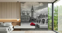 Capture the spirit of London with this striking wallpaper for walls. The design focuses on the iconic Big Ben and Houses of Parliament in a classic monochrome palette. A burst of vivid red roses and a charming hat add a touch of romance. This design brings a sophisticated and timeless feel to your living room, bedroom, or hallway. It offers a unique blend of classic architecture and modern flair, transforming your space into a stylish tribute to one of the world's most beloved cities.