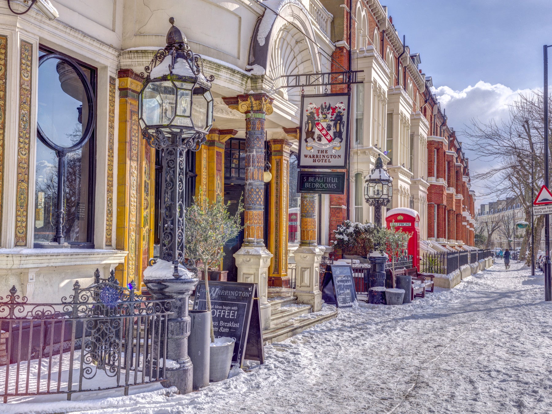 Maida Vale i Snow, London. Fang essensen af ​​en snedækket London -gade med dette tapet til vægge. Det præsenterer en klassisk hotelfasade, komplet med udsmykkede lamper og ikoniske røde telefonbokse, tæppet i Winter White. Farvepaletten afbalancerer mursten røde og snedækkede hvide med berøringer af guld i bygningens detaljer. Ideel til stuer eller gange bringer dette design en sofistikeret, historisk fornemmelse af ethvert rum, der fremkalder en følelse af rejse og urban elegance. Det supplerer interiør med sine raffinerede mønstre.