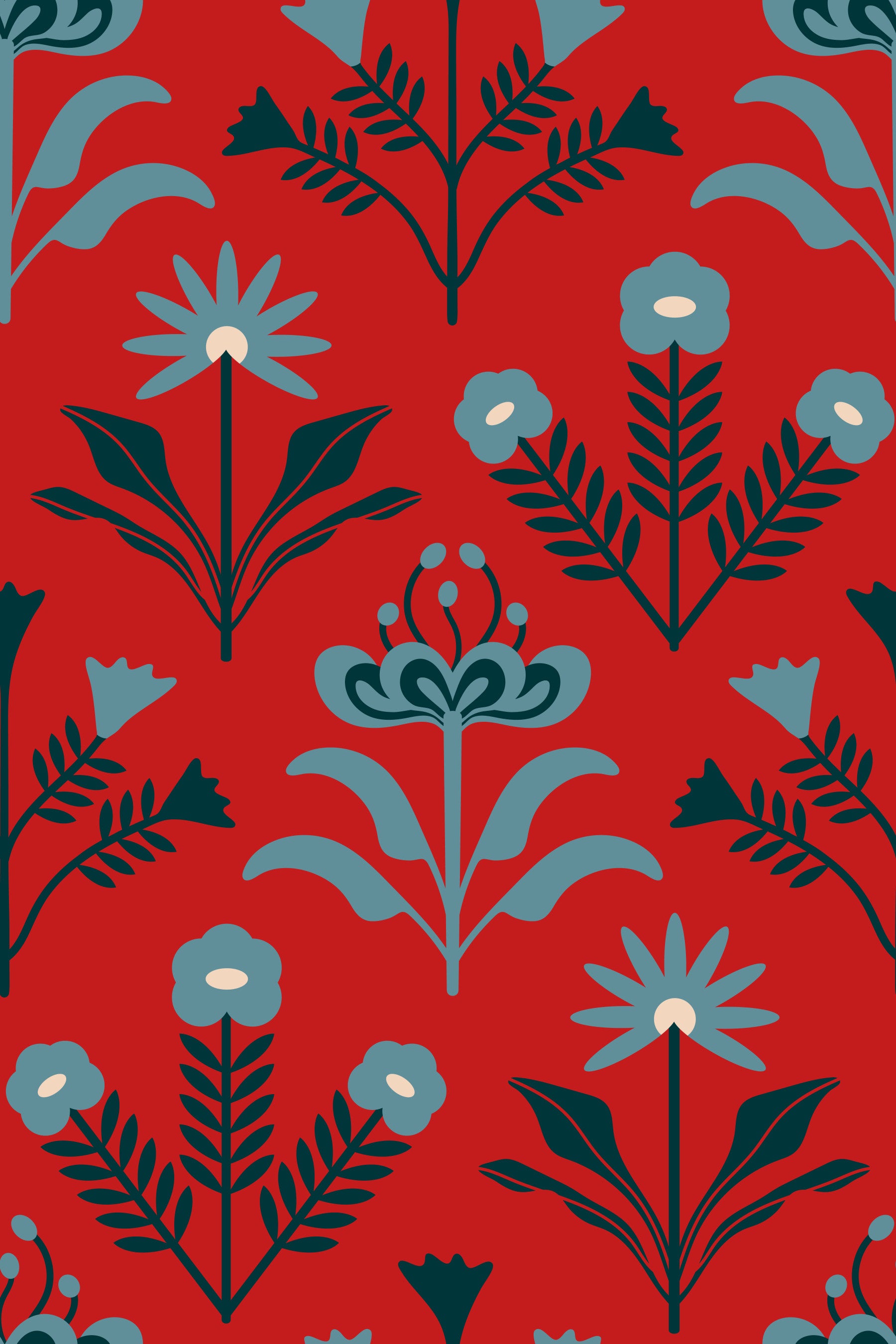 Tag en tur tilbage i tiden med Lora, et tapet, der smukt forener retro Mid-Century Modern-stil med et strejf af skandinavisk enkelhed og en blomsteragtig charme i cottage-stil. Dette blomstermønster har charmerende blomster i en palet af pulverblå, marineblå indigo og hvide blomster mod en rig, dybrød baggrund, hvilket skaber en dramatisk og indbydende atmosfære. De minimalistiske, men iøjnefaldende blomster fremkalder en følelse af nostalgi og håndlavet skønhed, perfekt til at bringe et strejf af stemningsfuld elegance til ethvert rum. Dets rene linjer og afbalancerede komposition legemliggør skandinavisk æstetik, mens de retro blomstermotiver tilføjer et legende og levende præg. Dette mønsterdesign fås også i andre farvekombinationer! Originalt tapetmønsterdesign af Jackie Tahara fra UnBlink Studio.
