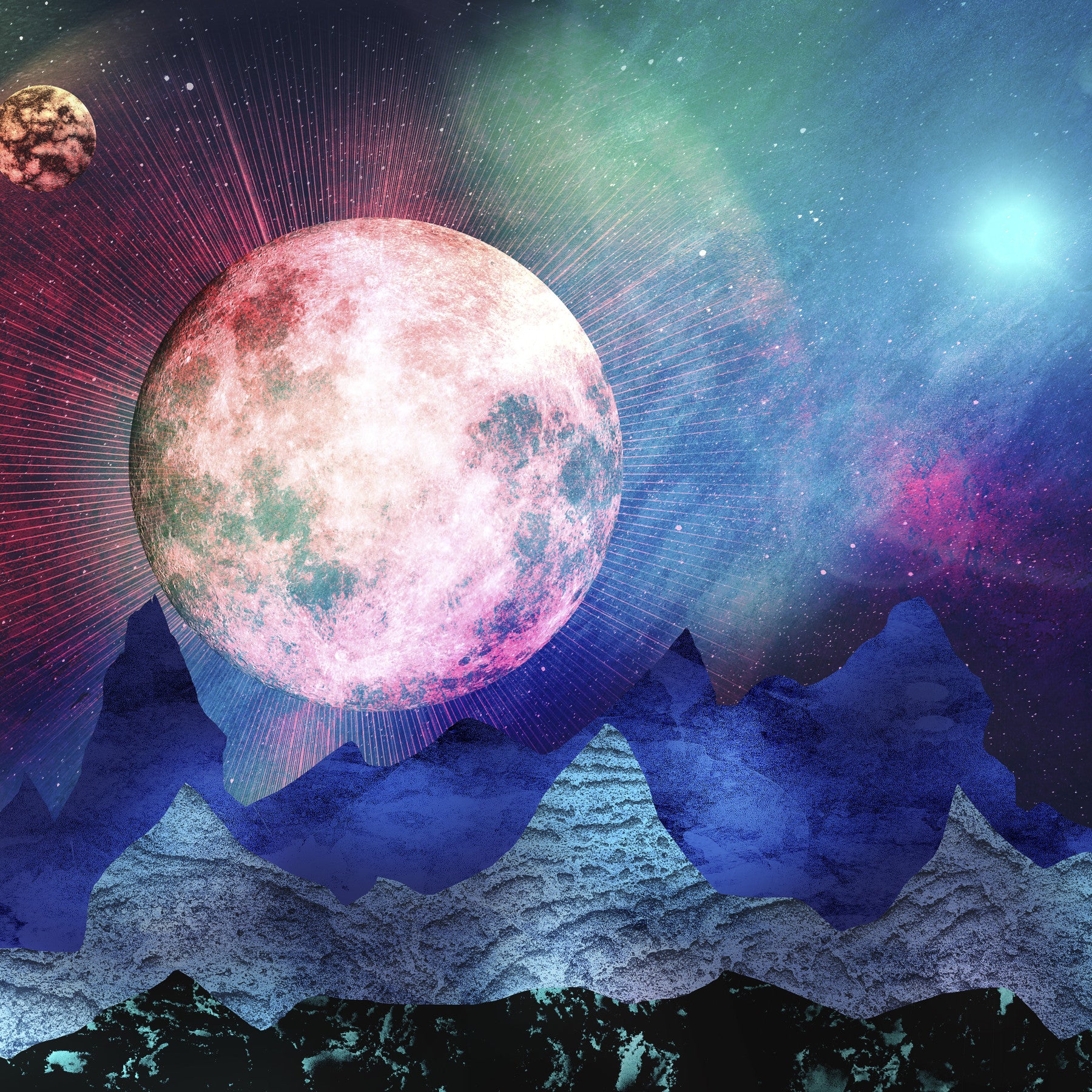Vidne til skue af en måneformørkelse, når den kaster sin anden verdensomspændende glød på et majestætisk udvalg af blå bjerge. 'Lunar Eclipse' fanger det betagende øjeblik i en pulserende, struktureret komposition. En stor, lyserød-farvet måne dominerer scenen, og dens lys oplyser toppene nedenfor med en æterisk udstråling. De mørkeblå bjerge er gengivet med en unik strukturel effekt, hvilket giver dem en følelse af dybde og vægt på det kosmiske baggrund af en stjernet-støvet nattehimmel. Farvepaletten fremkalder en følelse af ro og mysterium, mens den dramatiske belysning skaber en virkelig fængslende visuel oplevelse. Dette tapet er ideelt til dem, der værdsætter både den naturlige skønhed i bjerge og den mystiske lokkemåde af plads.
