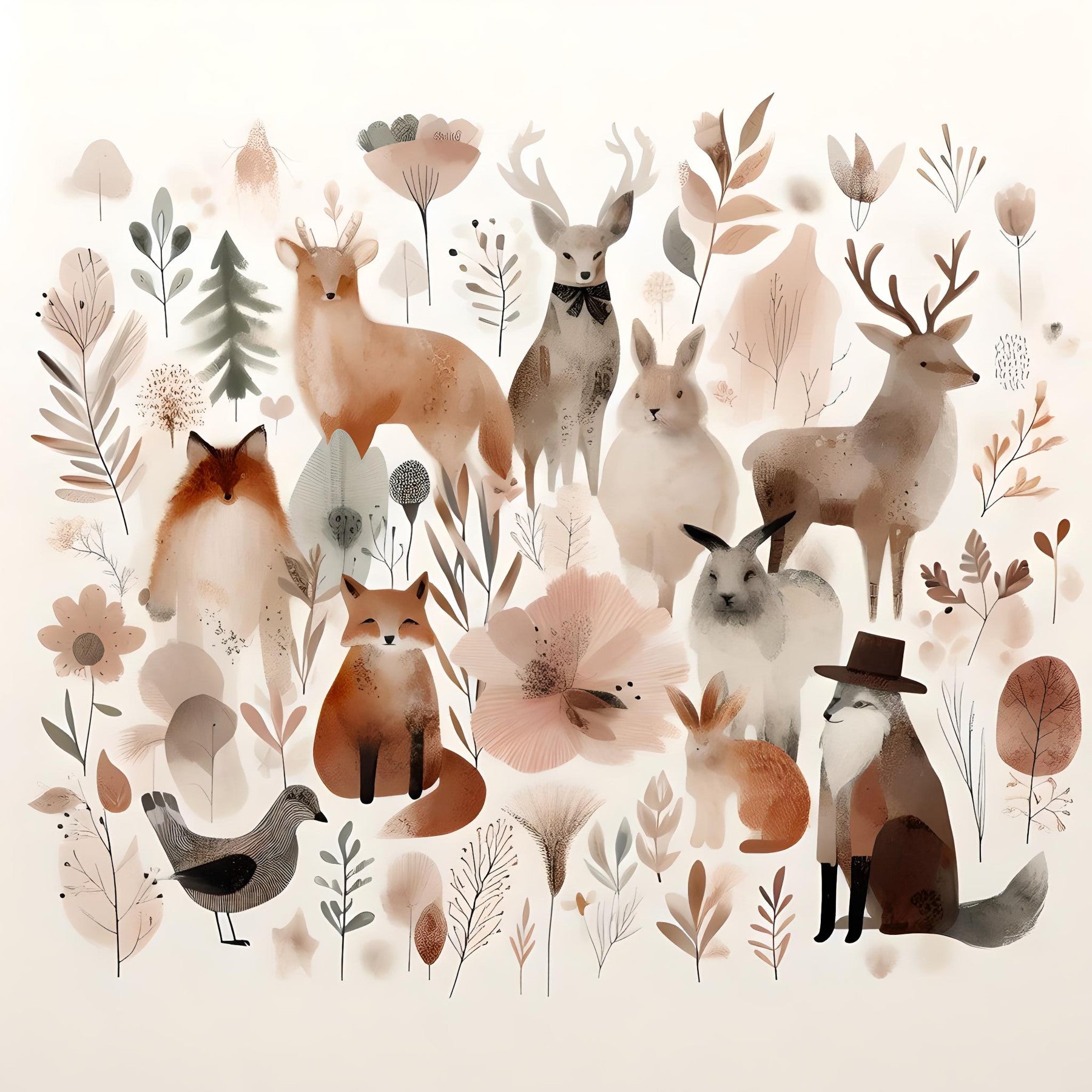 Omfavne den rolige skønhed i skoven med dette finurlige tapet. Delikat akvarelbørstestræk viser en charmerende samling af skovvæsener - hjorte, ræve, kaniner - midt i en blød palet med rødme pink, jordiske brune og dæmpede greener. Den håndtegnede stil fremkalder en følelse af ro og ro, hvilket skaber en fredelig atmosfære perfekt til soveværelser, planteskoler eller ethvert rum, der har brug for et strejf af naturens blide ånd. De subtile detaljer i flora og fauna tilføjer et lag med raffinement til dette charmerende og beroligende design, hvilket gør det ideelt til dem, der værdsætter undervurderet elegance og håndlavet kunst.