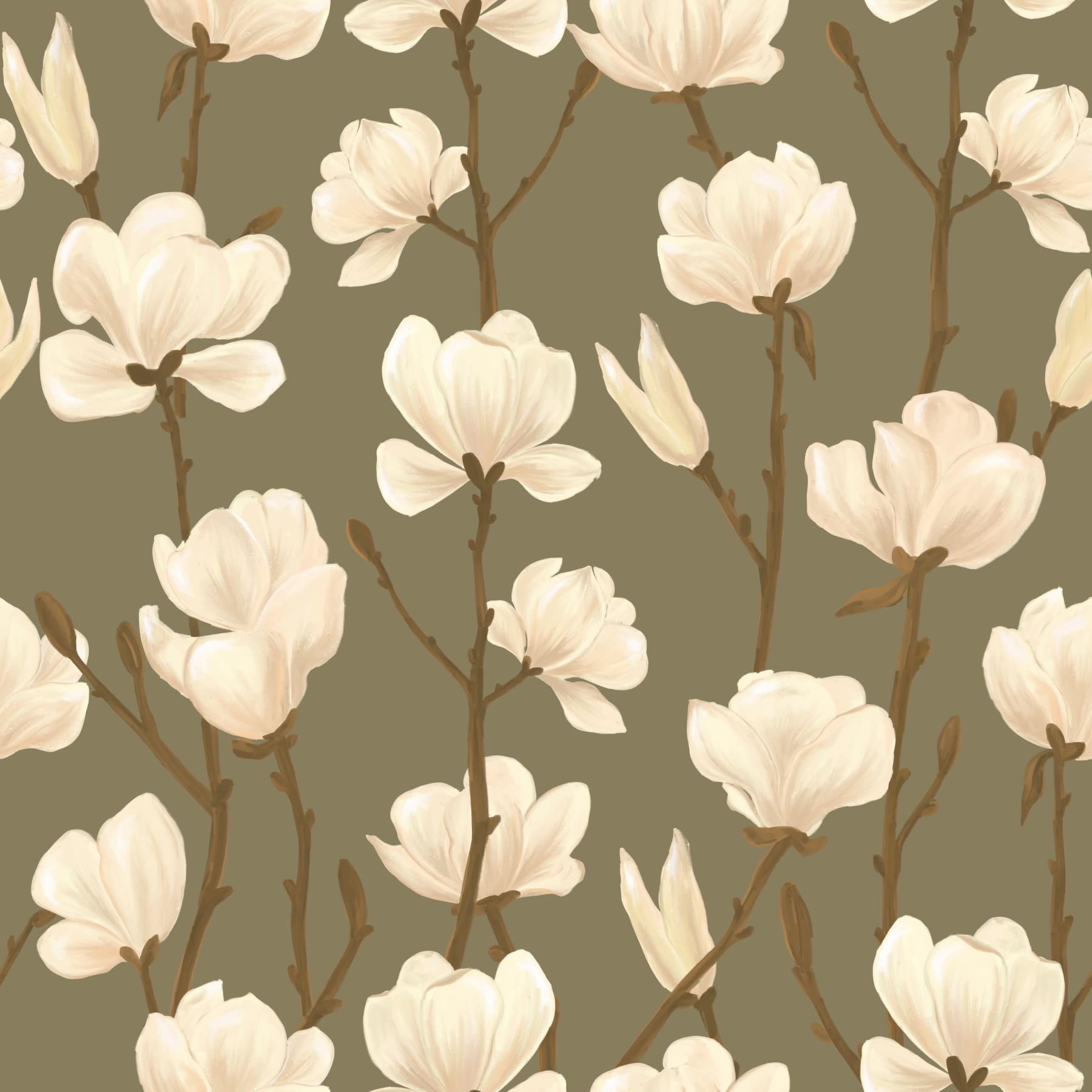 Giv dit rum et blidt og jordnært look med tapetet Magnolia Still – Earth Haze. Cremede magnoliablomster hviler på slanke brune stilke mod en dæmpet jordagtig baggrund. Dette blomstermønster har en rolig og naturlig fornemmelse og er perfekt til soveværelser, læsehjørner eller hyggelige opholdsområder. Den bløde penselstrøgseffekt giver hvert kronblad en varm og naturtro charme. Brug dette tapet til vægge for at tilføje subtile detaljer uden at overdøve rummet. Det passer smukt sammen med trædetaljer og bløde stoffer og skaber et rum, der føles både afslappet og raffineret. Ideelt til dem, der sætter pris på blomsterdesign med en underspillet palet.