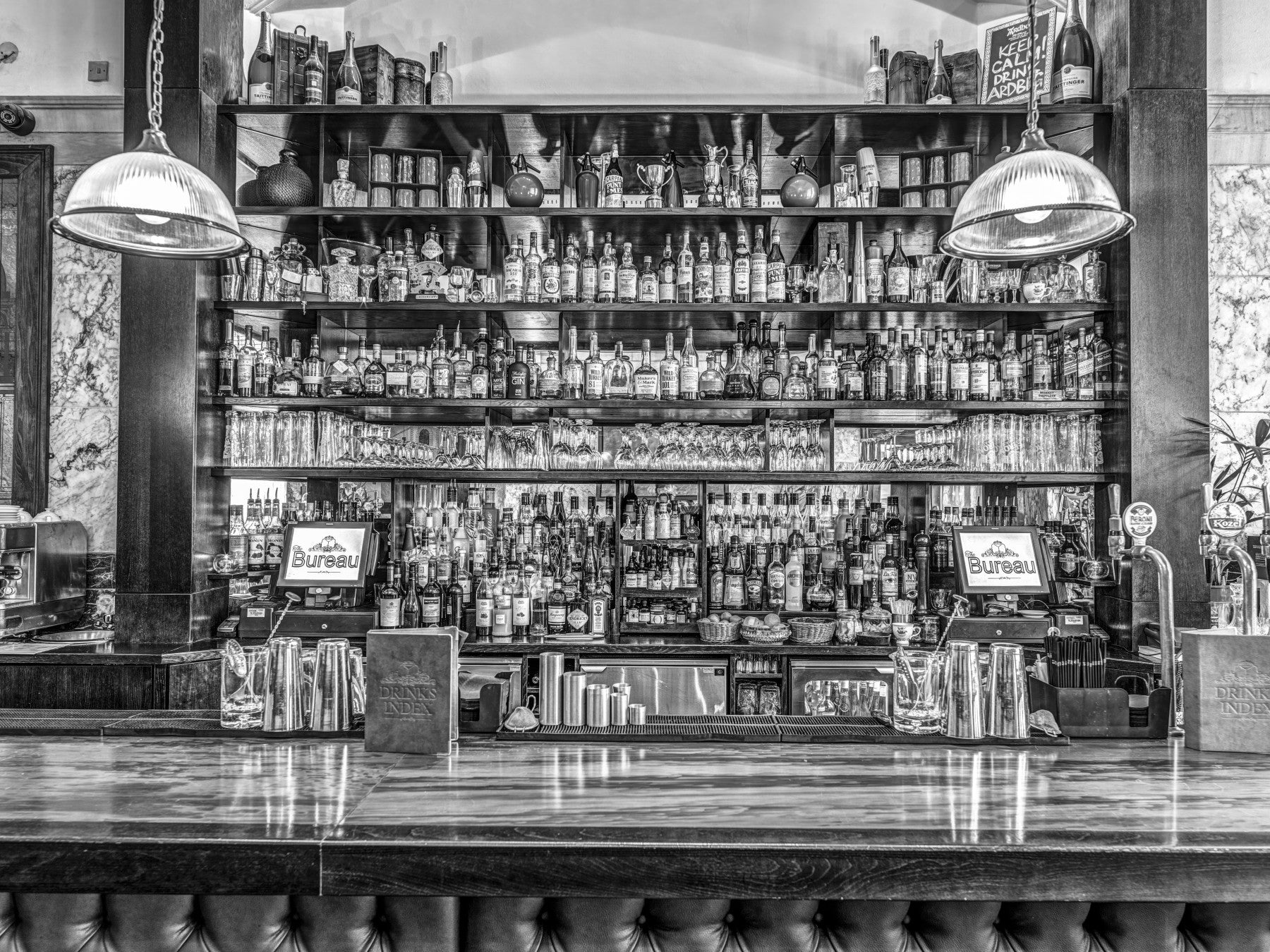 The image shows a full wall with a bar counter and shelves of bottles.