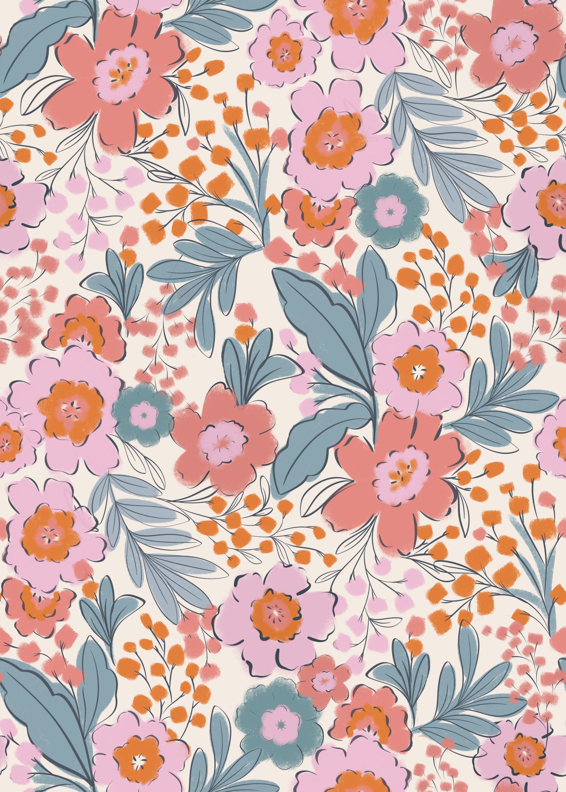 Løft din indretning med 'maleriske blomster', et pulserende tapetdesign. Billedet viser en problemfri spredning af stiliserede blomster og blade i dæmpede toner af lyserød, orange og blå. Fed linjer og synlige børstestræk definerer hvert element. Dette blomster tapet til vægge afgiver en erklæring. Det er perfekt til en stue eller pulverrum. Dette design skaber en atmosfære af kunstnerisk flair og tilføjer varme til dit hjem. Den maleriske stil giver rummet en frisk og moderne fornemmelse.