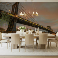 Adorn your space with this breathtaking vista of the Manhattan Bridge, a view that captures New York City's vibrancy at twilight. This wallpaper for walls presents the iconic bridge set against a softly lit skyline, with the water reflecting the city lights. The dusky sky casts a peaceful, sophisticated tone. Ideal for a modern living space, study, or office, this design helps establish a focal point in your interior, seamlessly integrating with various styles. The warmth of the golden lights against the cool greys provides a striking visual balance.