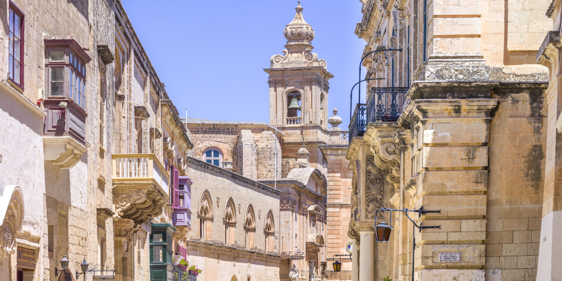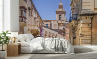 Old buildings in Mdina, Malta. Transport yourself to the sun-drenched streets of Mdina with this captivating wallpaper. The design showcases the city's architectural details, from its majestic bell tower to the ornate balconies. Hues of beige, cream, and subtle greens evoke a sense of warmth and history. This wallpaper for walls brings old-world charm to spaces such as living rooms, hallways, or studies. It complements interiors with classic or Mediterranean decor, making every room feel like a historical escape.