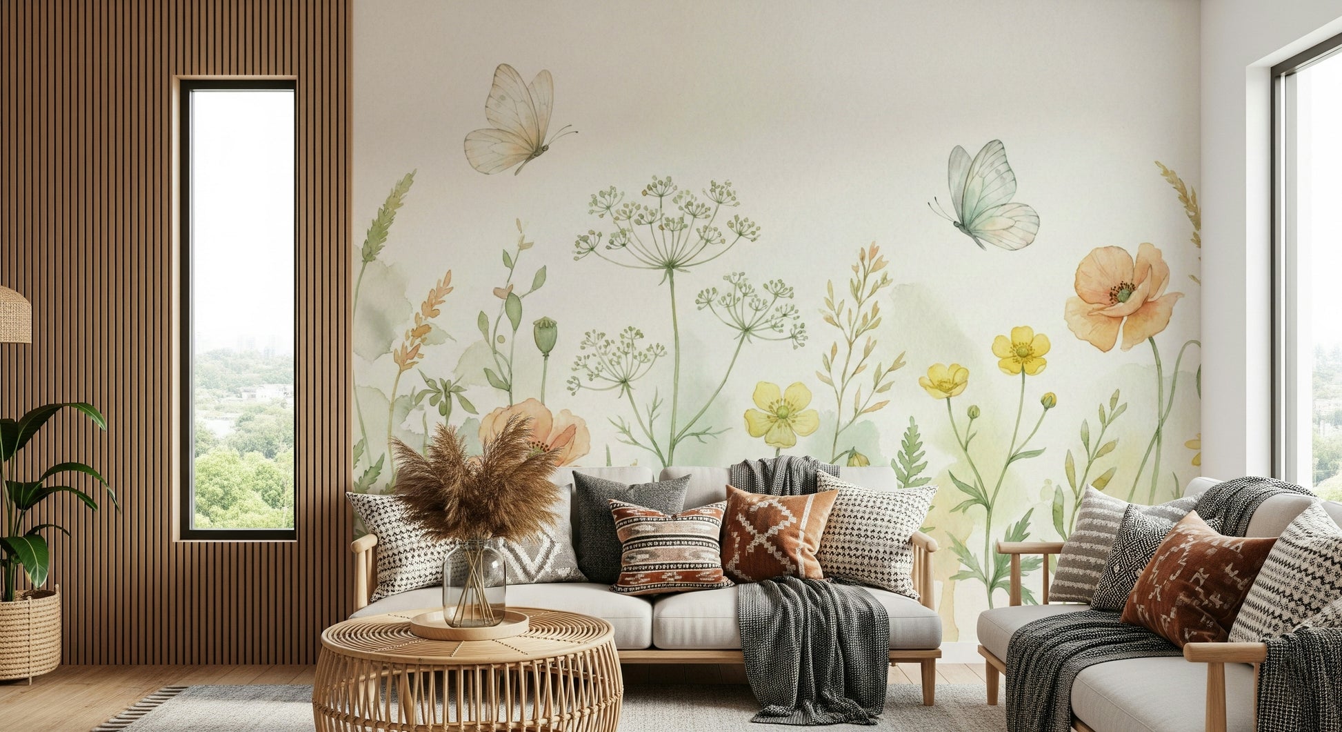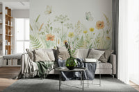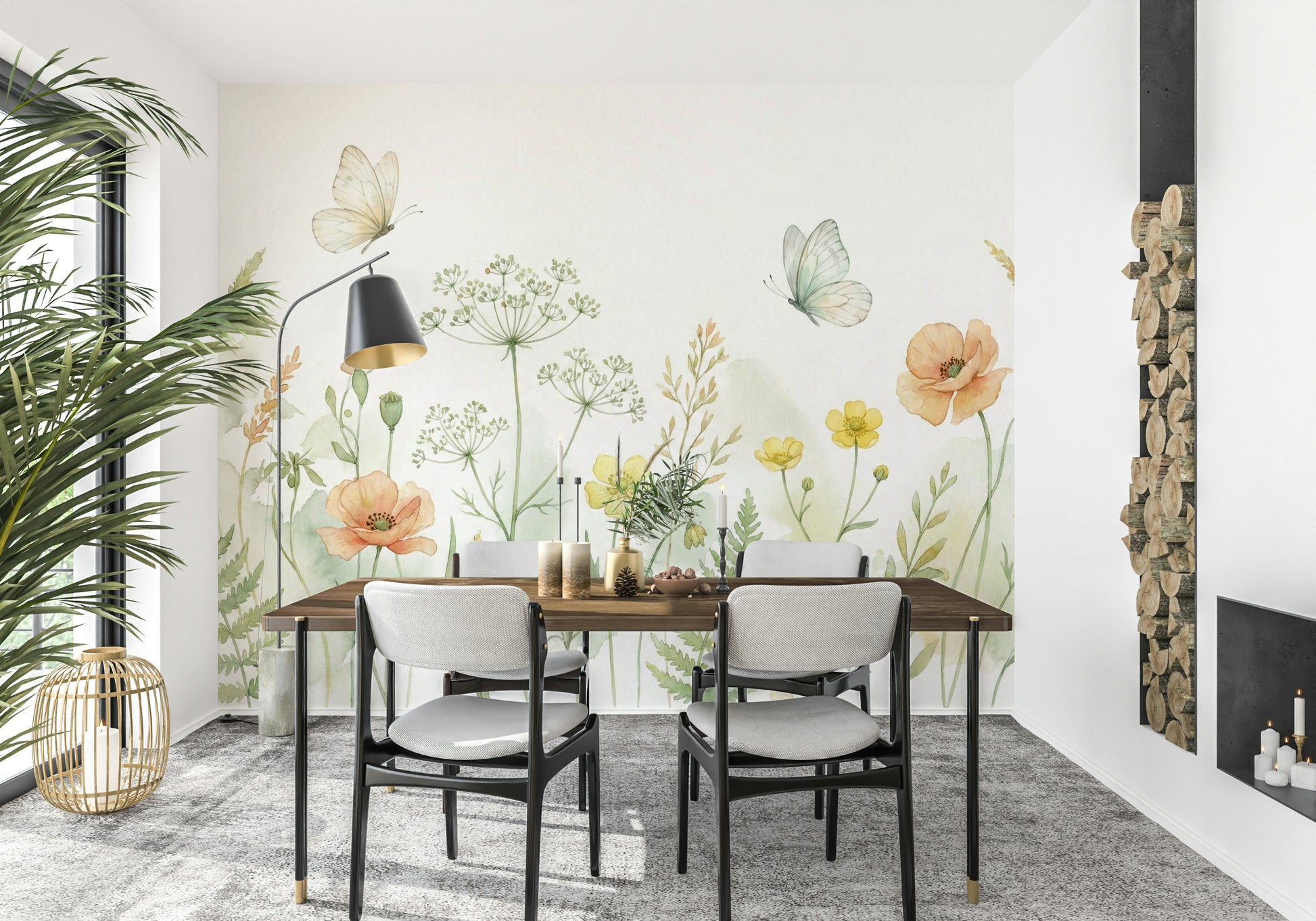 Bring the tranquility of a watercolor meadow into your home with this delicate wallpaper for walls. Featuring gentle hues of green, yellow, and peach, interspersed with butterflies, ferns, and wildflowers, this design creates a serene and airy atmosphere. The soft brushstrokes and botanical details add a touch of artistic elegance, perfect for transforming a bedroom into a restful retreat or enhancing the calming ambiance of a living room. Complement minimalist decor or add subtle color to a neutral space. This wallpaper makes any interior feel lighter and more inviting.