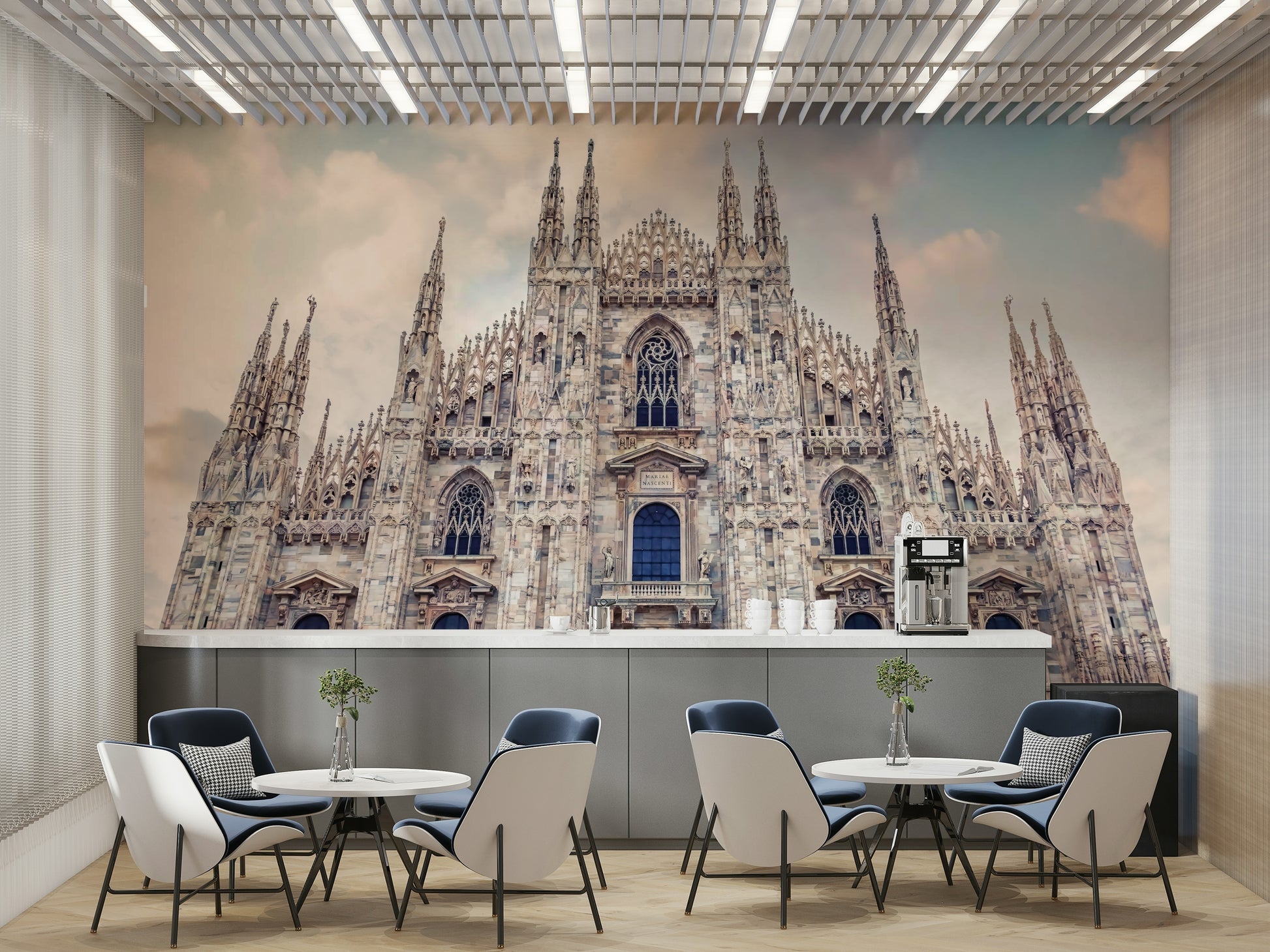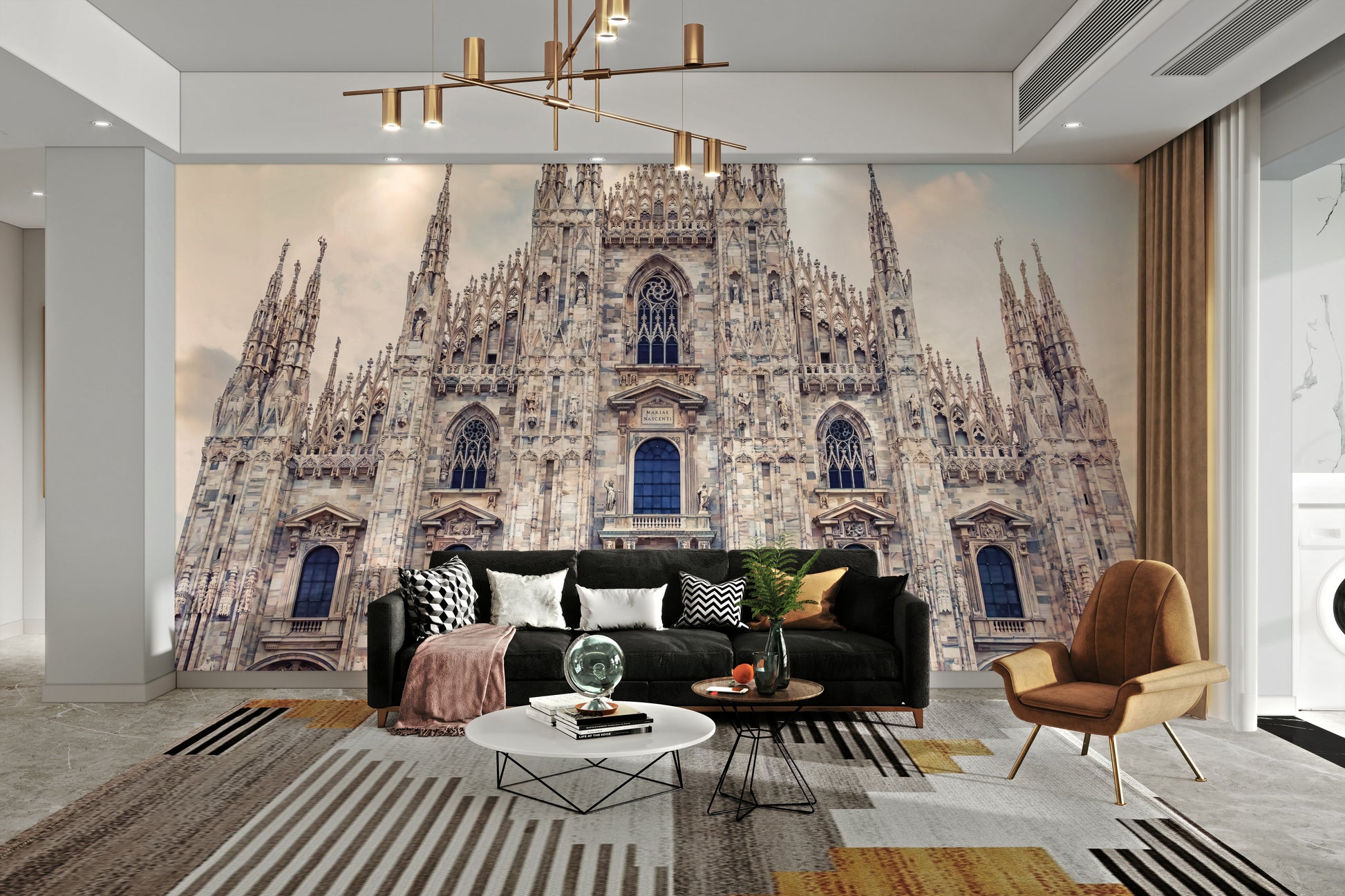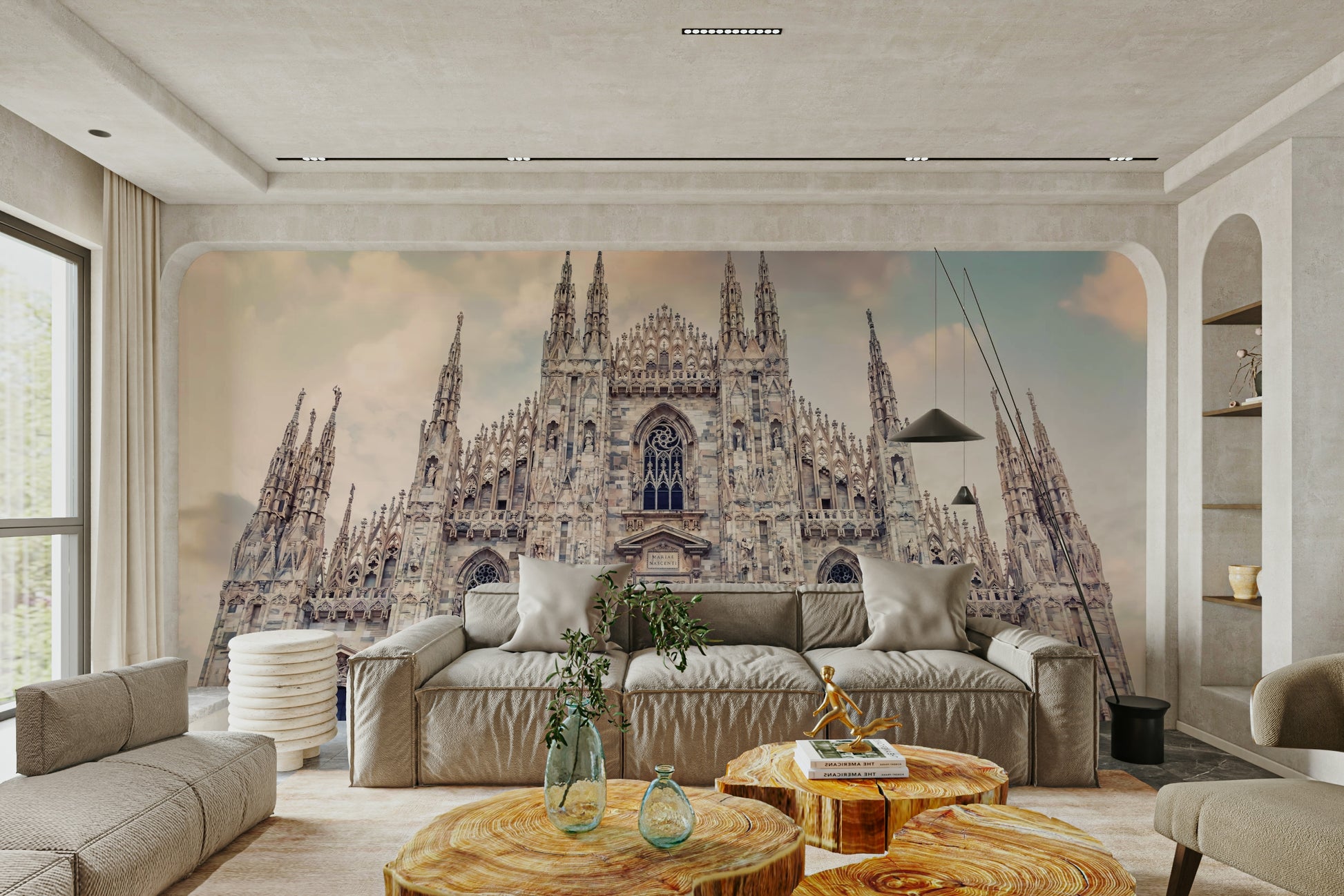 This wallpaper showcases the grandeur of Milan Cathedral with its intricate Gothic architecture reaching towards a soft, cloud-dusted sky. The design features neutral tones that blend effortlessly, bringing a touch of European elegance to your space. Use this wallpaper for walls to add a sophisticated backdrop to living rooms, bedrooms, or hallways. Its calming color palette and historical charm also make it an excellent choice for a home office or library.