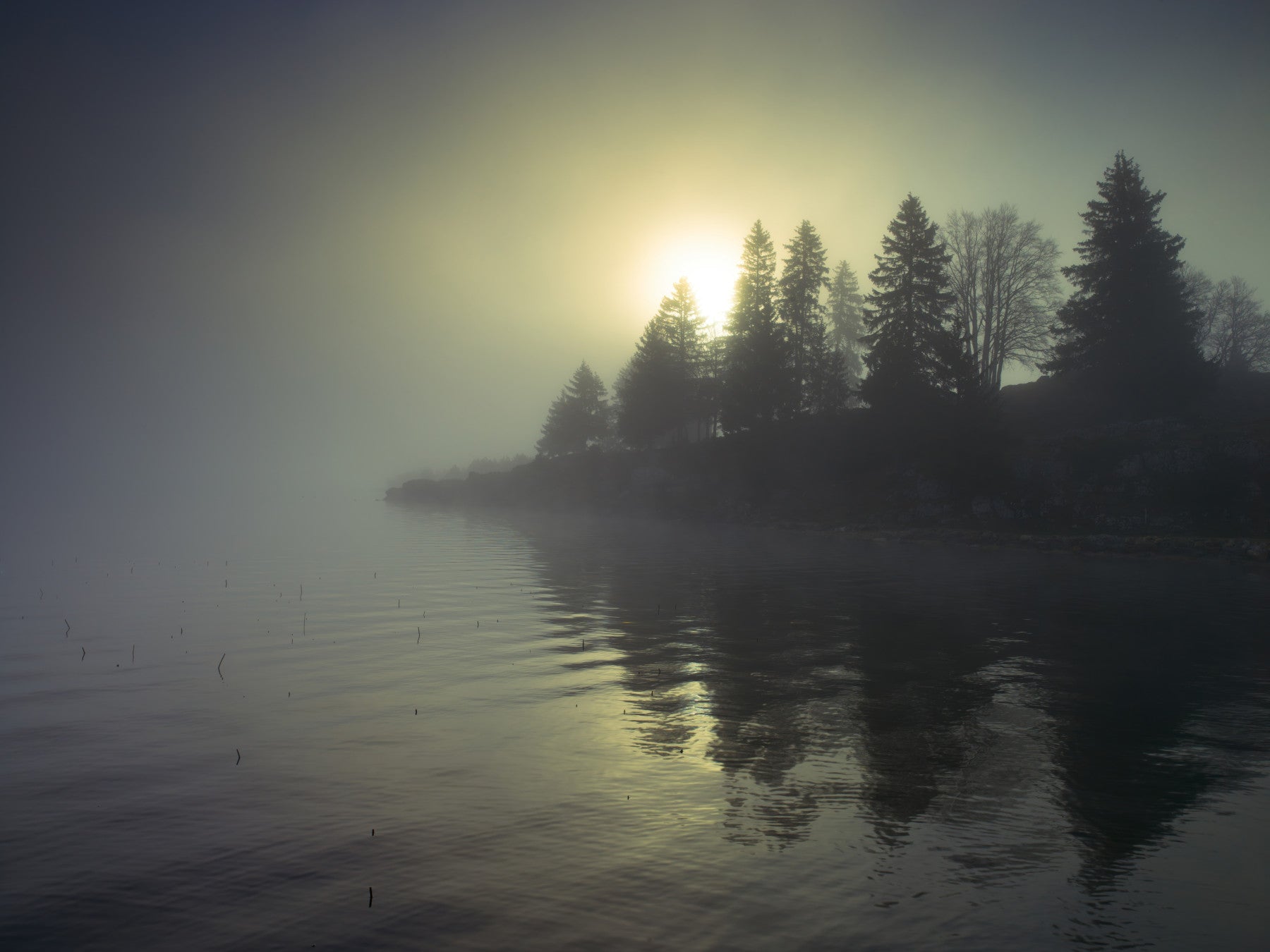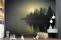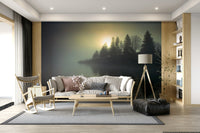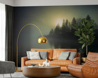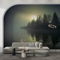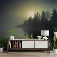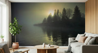 Still lake at misty dawn. Wrap your walls in the tranquil embrace of "Misty Dawn." This atmospheric wall décor captures the ethereal beauty of a lakeside landscape awakening in the soft, muted light of early morning. Silhouetted trees stand sentinel against a backdrop of swirling mist, their forms partially obscured, hinting at the mysteries hidden within the tranquil scene. The sun, a luminous orb barely visible through the haze, casts a gentle, golden glow that reflects softly on the still water, creating a serene and reflective ambiance. This evocative scene invites contemplation and a sense of peaceful escape, perfect for creating a calming sanctuary within your living space. Bring the serene beauty of nature's awakening into your home.