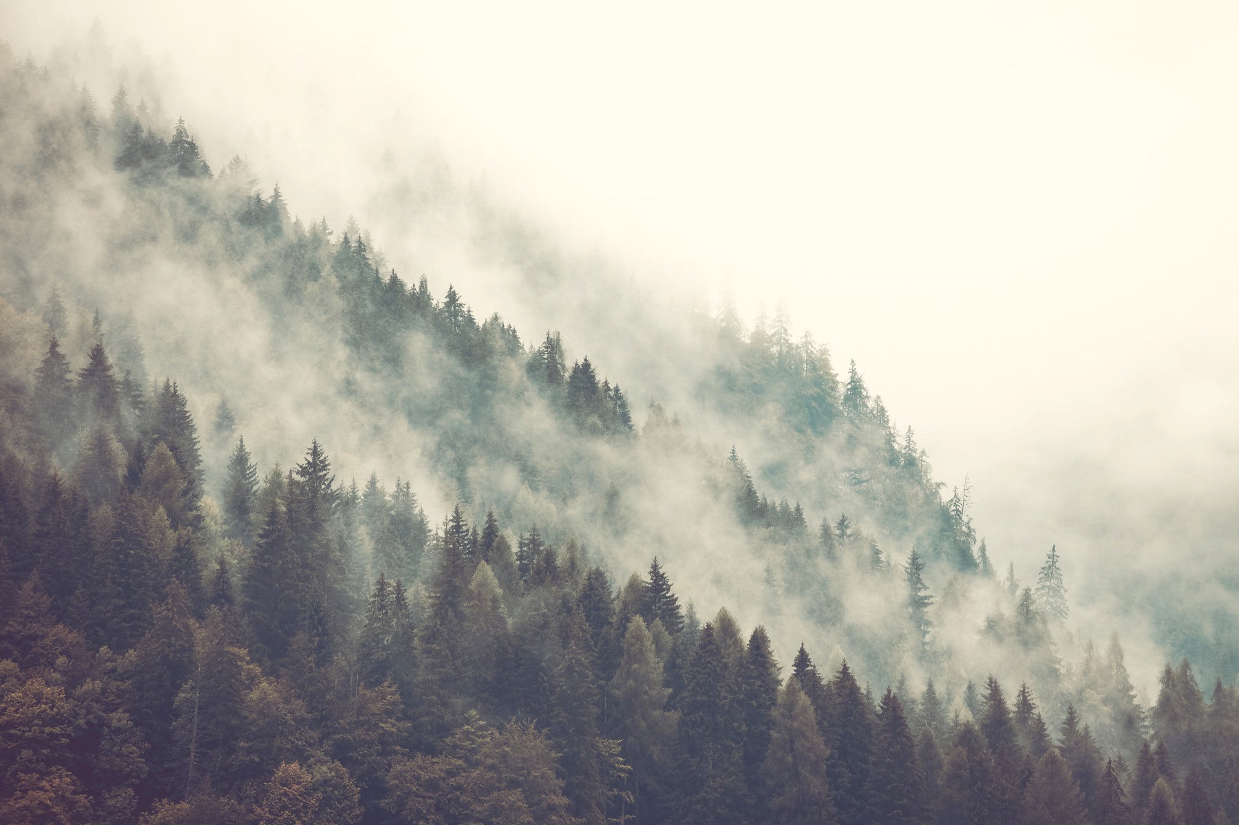 A contemplative misty hillside wallpaper mural for a feature wall.