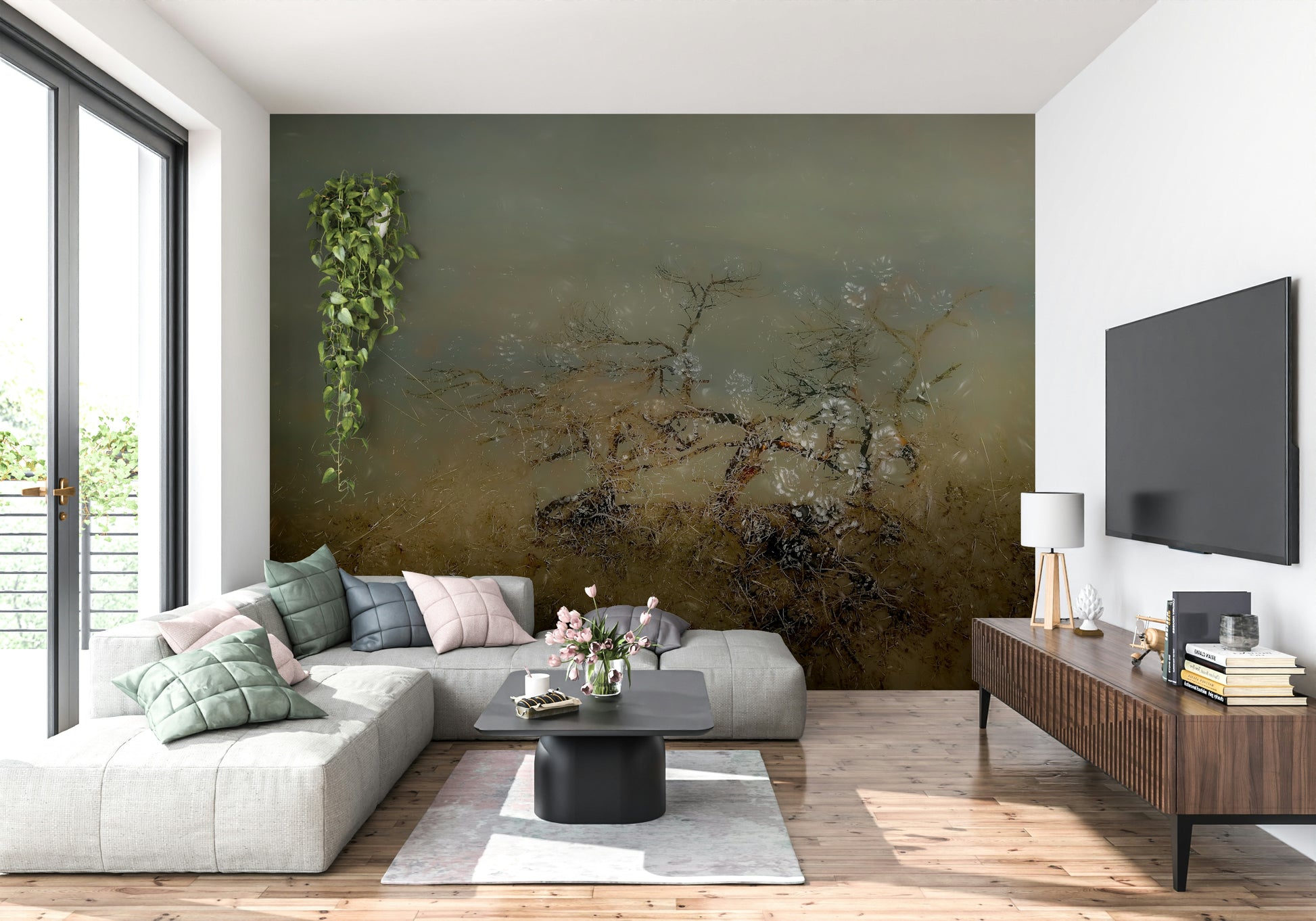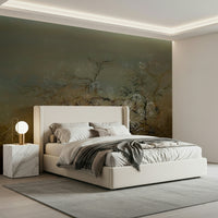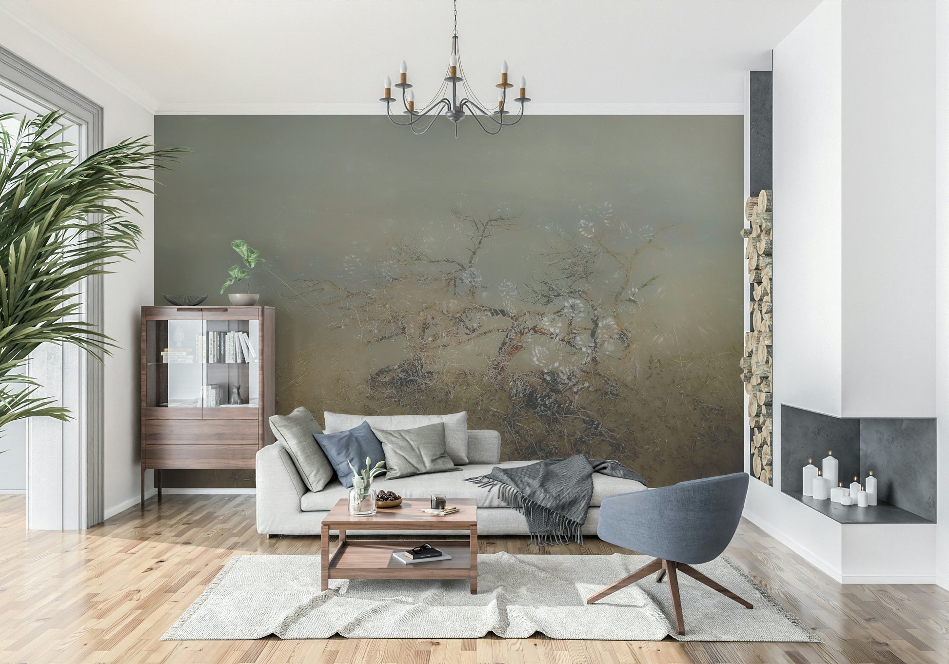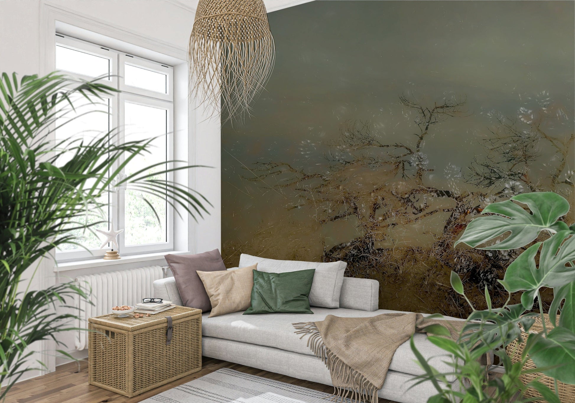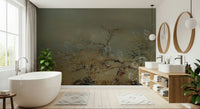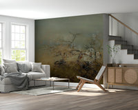 Capture the serene essence of a tranquil landscape with this mesmerizing wallpaper for walls. The blend of beige, brown, and muted green creates a soothing scene featuring bare tree branches amidst a misty atmosphere. This design enhances living rooms, bedrooms, or studies, bringing a touch of understated elegance to any space. The subtle tones and brushstroke style create a calming and inviting ambiance, perfect for a peaceful retreat.