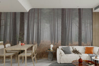 Misty forest with tall trees and foliage. Step into a tranquil woodland with this beautiful wallpaper for walls. The design features tall, slender trees enveloped in a gentle fog, creating a sense of peace and mystery. The color palette focuses on muted browns and subtle grays, offering a versatile backdrop for various rooms. Use this design to create a soothing bedroom, a relaxing living area, or an inviting hallway. The forest scene brings a touch of nature indoors. This forest complements many interiors.