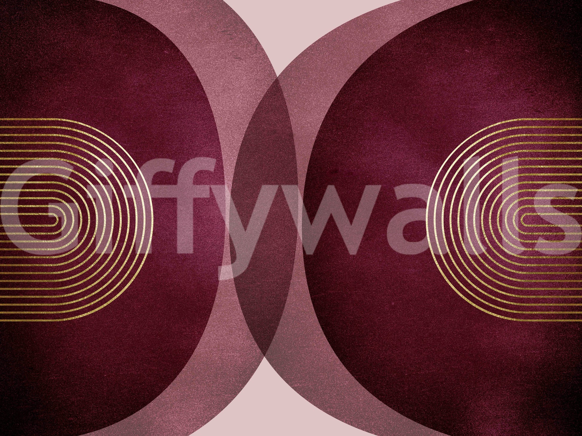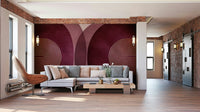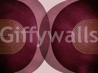 Forkæl dig med den sofistikerede elegance i dette moderne bordeauet i midten af ​​århundrede. Rige Bourgogne -nuancer, der minder om en luksuriøs vin, danner baggrunden for subtilt strukturerede, overlappende cirkler. Delikate guldmetalliske linjer, arrangeret i elegante koncentriske buer, tilføjer et strejf af raffineret glamour, der gentager de geometriske mønstre for moderne design fra midten af ​​århundrede. Dette tapet udstråler en følelse af rolig sofistikering, perfekt til at tilføje et strejf af vintage-inspireret luksus til ethvert moderne rum. Samspillet mellem dybe bordeaux og dæmpede rosetoner, kontrast til det skinnende guld, skaber et visuelt fantastisk og harmonisk design, der er både moderne og tidløs.