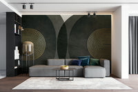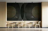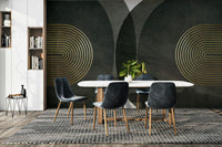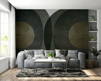 Løft dit digitale rum med dette sofistikerede tapet, en perfekt blanding af moderne og midten af ​​århundredes design. Dybe kulgrå cirkler, struktureret med et subtilt korn, skaber et beroligende baggrund. Disse er elegant accenteret af koncentriske gyldne buer og tilføjer et strejf af luksuriøs varme og geometrisk præcision. Kontrasten mellem det matte trækul og det skinnende guld fremkalder en følelse af raffineret enkelhed, hvilket afspejler et tidløst æstetisk ideal. Dette tapet er ideelt til dem, der søger en stilfuld og beroligende atmosfære med et antydning af overdådighed.