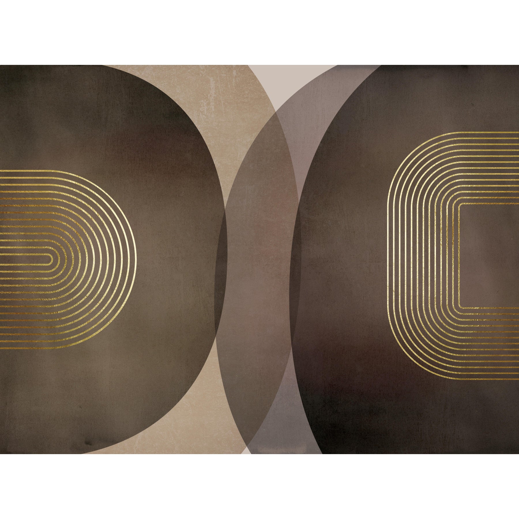 Dette tapet legemliggør essensen af ​​det moderne midterste århundrede rustik med sin sofistikerede blanding af jordagtige toner og geometrisk nåde. Subtile strukturerede baggrunde i dæmpede brune og beige skaber en følelse af rolig rustitet, mens de slående guld-tonede, koncentriske buede linjer introducerer en moderne, næsten minimalistisk æstetik. De overlappende semi-cirkler antyder en følelse af dybde og bevægelse, der perfekt afbalancerer de organiske og geometriske elementer for et roligt, men alligevel visuelt engagerende design. Dette stykke er perfekt til at tilføje et strejf af undervurderet elegance til ethvert moderne eller rustikt-inspireret rum.