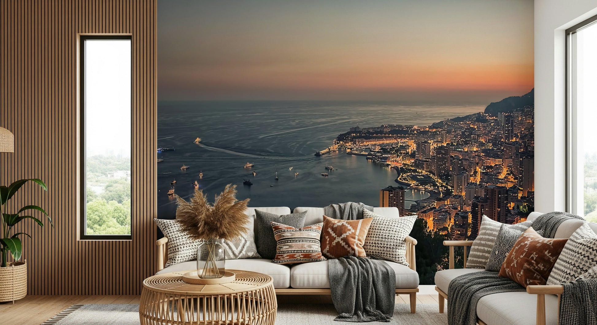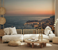 Experience the radiant beauty of Monaco at twilight with this stunning wallpaper for walls. The design captures the city's twinkling lights against the darkening sky and the vast expanse of the sea. Its colors mix from the fading oranges and pinks of the sunset to the deep blues of the water, creating a tranquil mood. Ideal for a living room or bedroom, the calming colors add peace to any space. Consider using it in a home office to foster creativity. This wallpaper seamlessly integrates with modern or contemporary interiors.