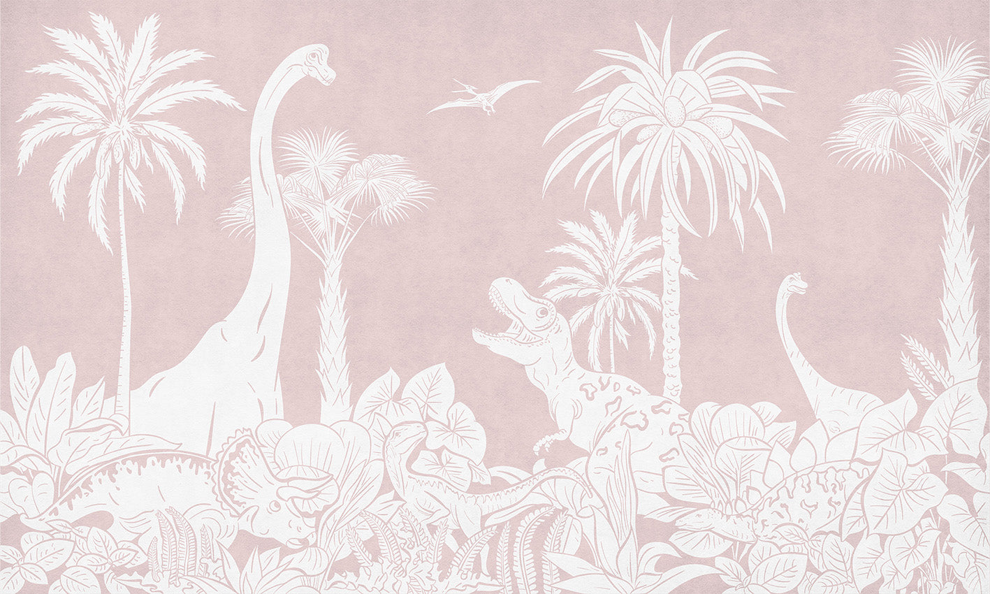 Tropical dinosaur design on pink wallpaper for kids' rooms.