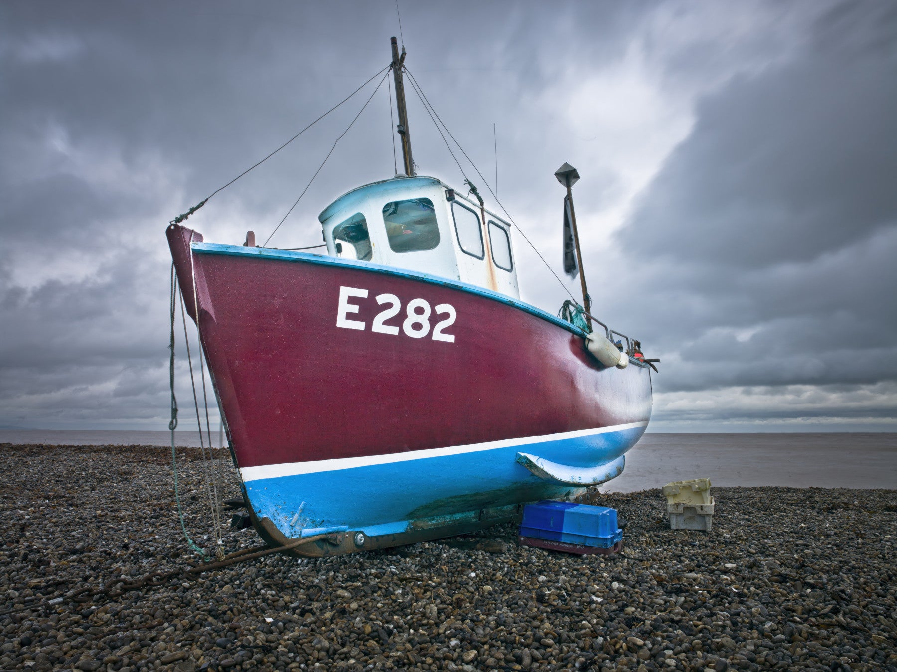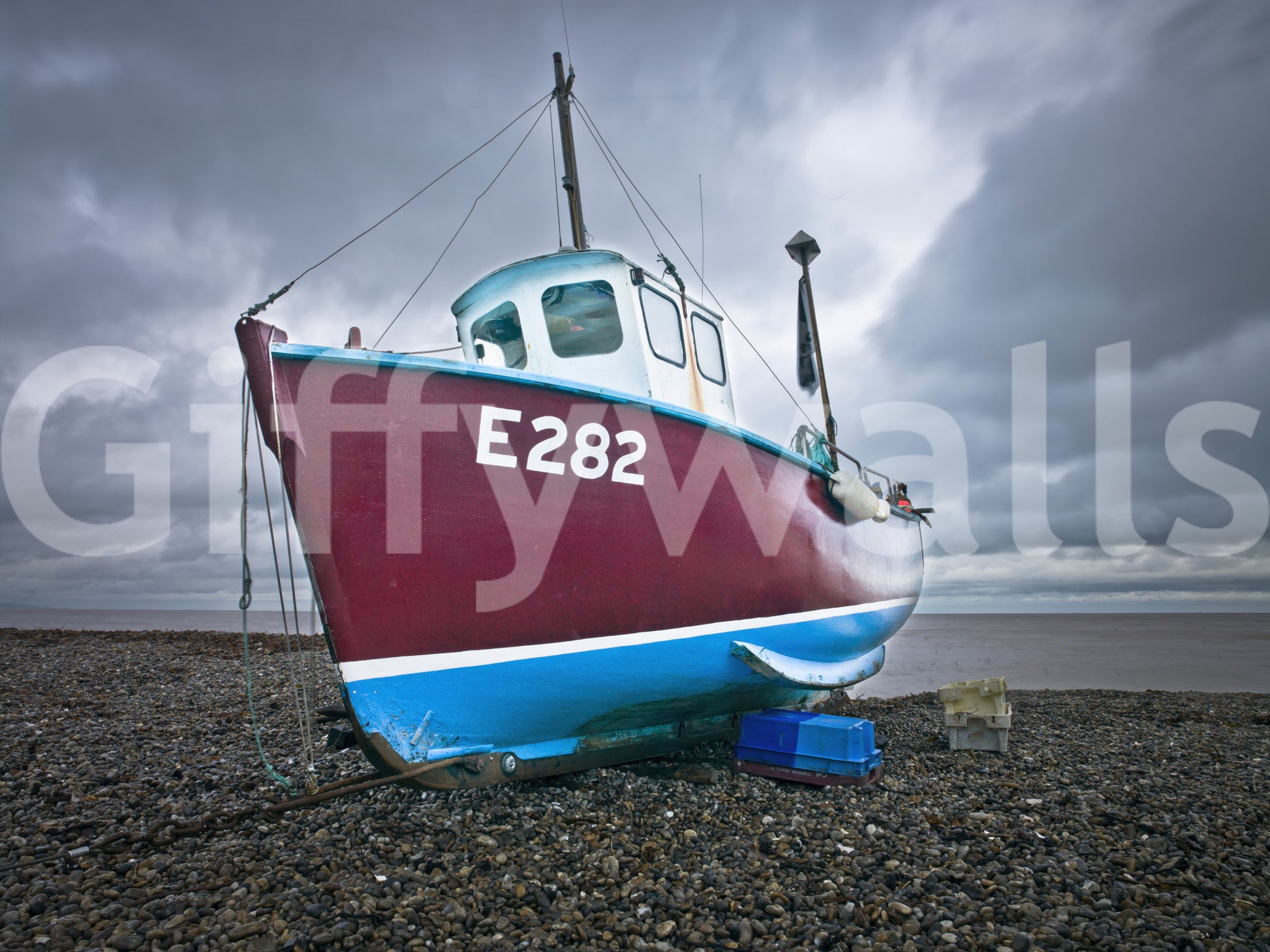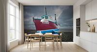 Fiskerbåd fortøjet ved kysten, Dorset-kysten, England. Bring den rolige havets ånd ind i dit hjem med dette fængslende vægtapet. Billedet forestiller en båd, der hviler på en stenstrand under en overskyet himmel, med en farvepalet domineret af nuancer af rød, blå og hvid. Bådens forvitrede tekstur tilføjer rustik charme, mens den marine atmosfære fremkalder en følelse af fred og flugt. Dette tapet fungerer smukt i en stue, et arbejdsværelse eller endda et badeværelse og skaber en rolig kystatmosfære. Dets klassiske nautiske tema komplementerer både moderne og traditionel indretning og beriger rummet med et strejf af maritim historie.