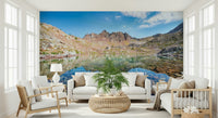 Immerse yourself in the peace of a clear mountain lake with this wallpaper. The design features crystal waters reflecting the surrounding peaks under a bright sky. The rock formations beneath the water's surface add depth. Its cool blues and earth tones bring a calm atmosphere to any room. Install this scenic wallpaper for walls in bedrooms, living rooms, or offices to create a calming retreat. This design smoothly complements modern or rustic interiors, and fills your space with a sense of nature.