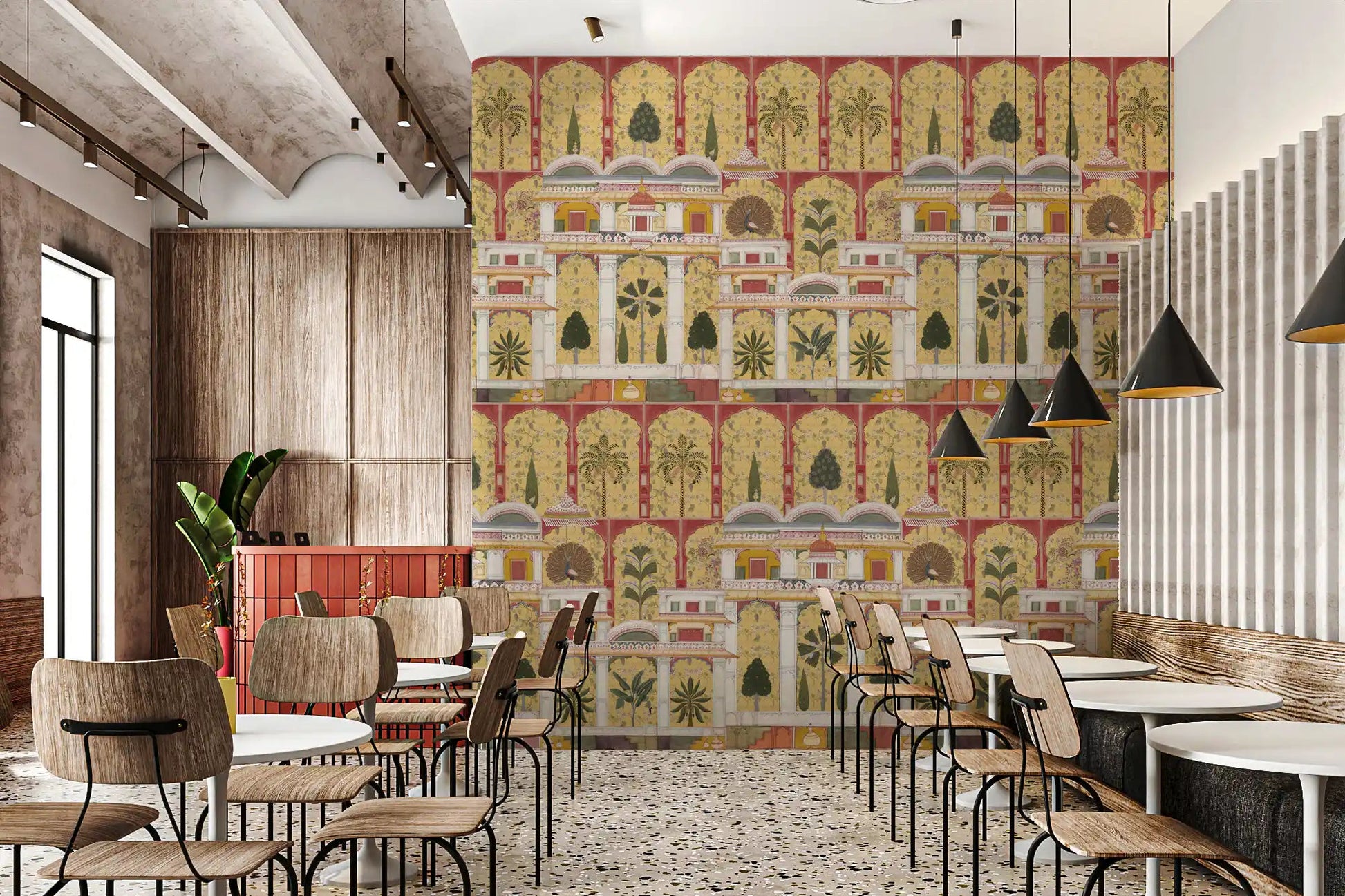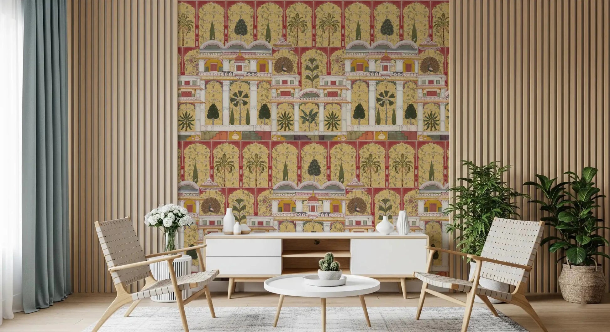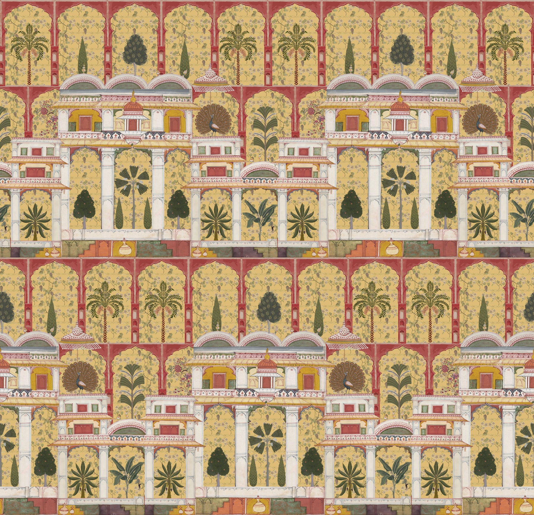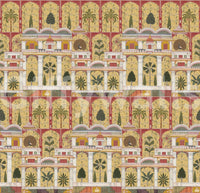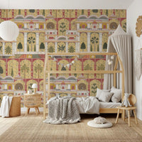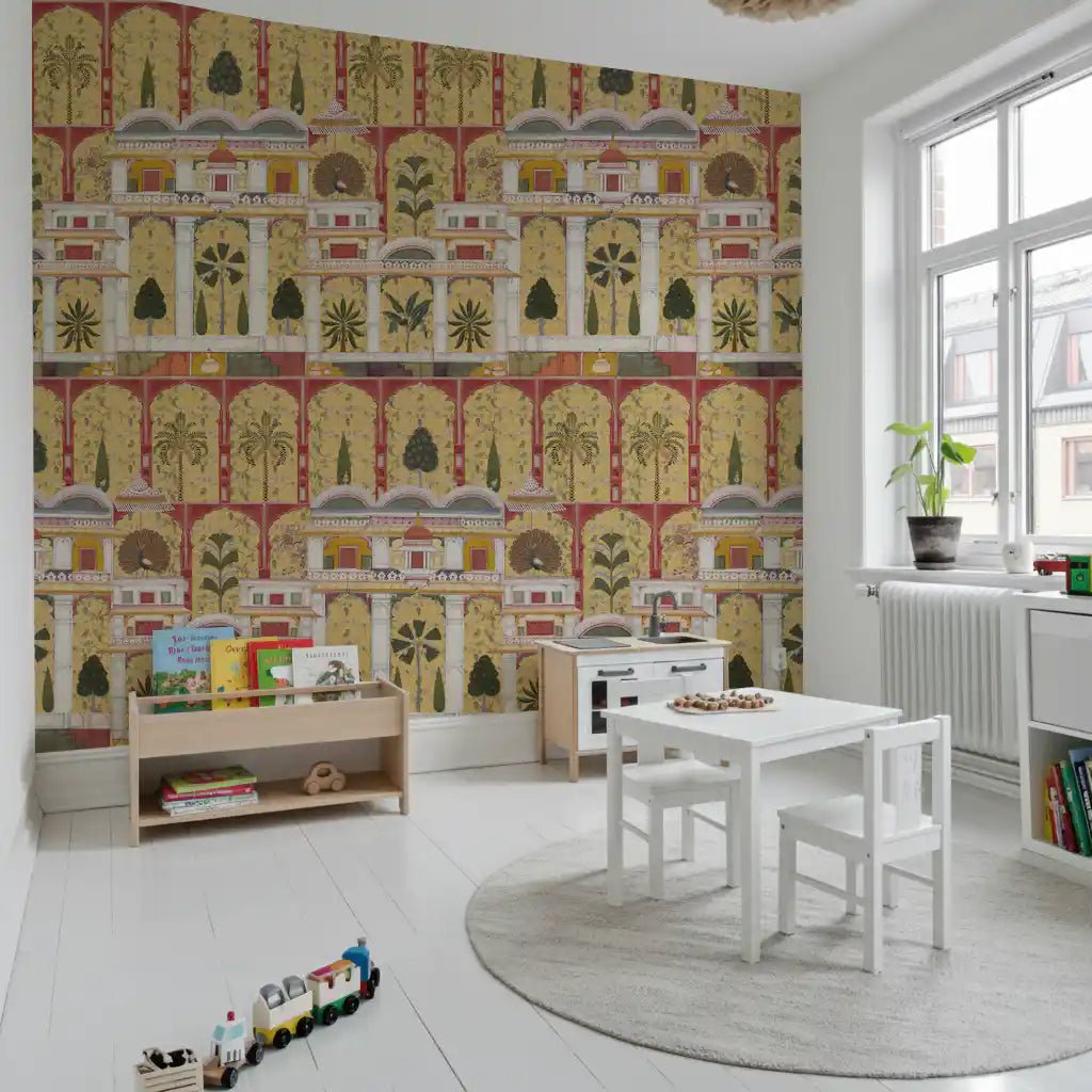 Forvandl din stue med dette udsøgte vægtapet, der har en betagende gengivelse af en traditionel indisk paladshave. Dette fængslende design fremviser et indviklet gentagende mønster af store arkitektoniske buer, frodige palmer, eksotiske bananplanter og elegante påfugle, alt sammen gengivet i den tidløse stil af miniaturemalerier. Den rige farvepalet kombinerer varme gyldne gule og dybe rødbrune nuancer med grønne, cremehvide farver og antydninger af orange, hvilket fremkalder en følelse af historisk storhed. Denne luksuriøse vægdekoration skaber et majestætisk fokuspunkt, perfekt til en sofistikeret stue, en overdådig spisestue eller en dramatisk entré. Det detaljerede kunstværk bringer kulturel dybde og en fortryllende atmosfære til ethvert interiør.