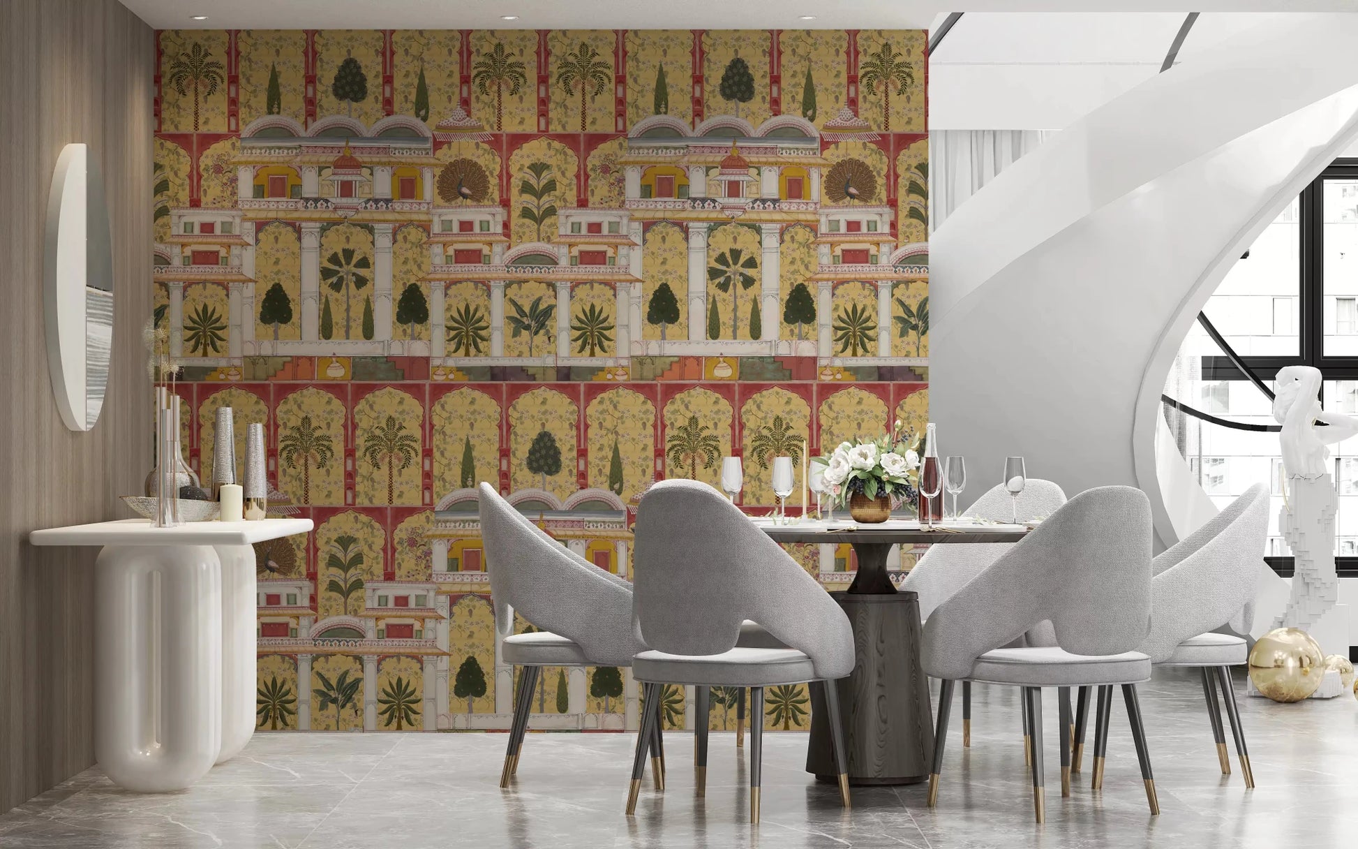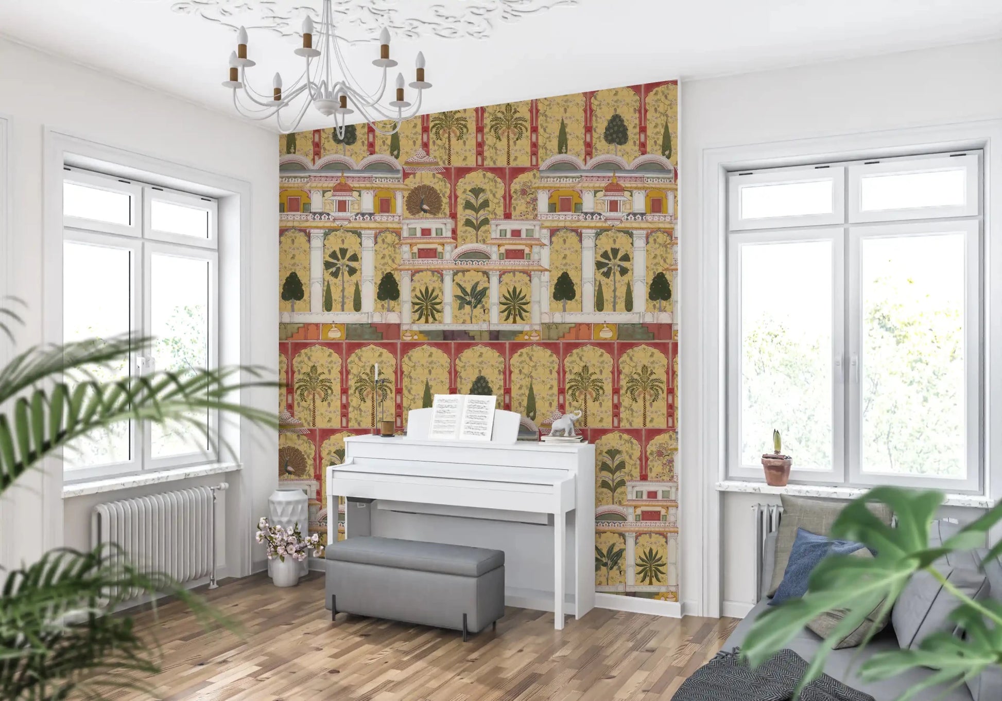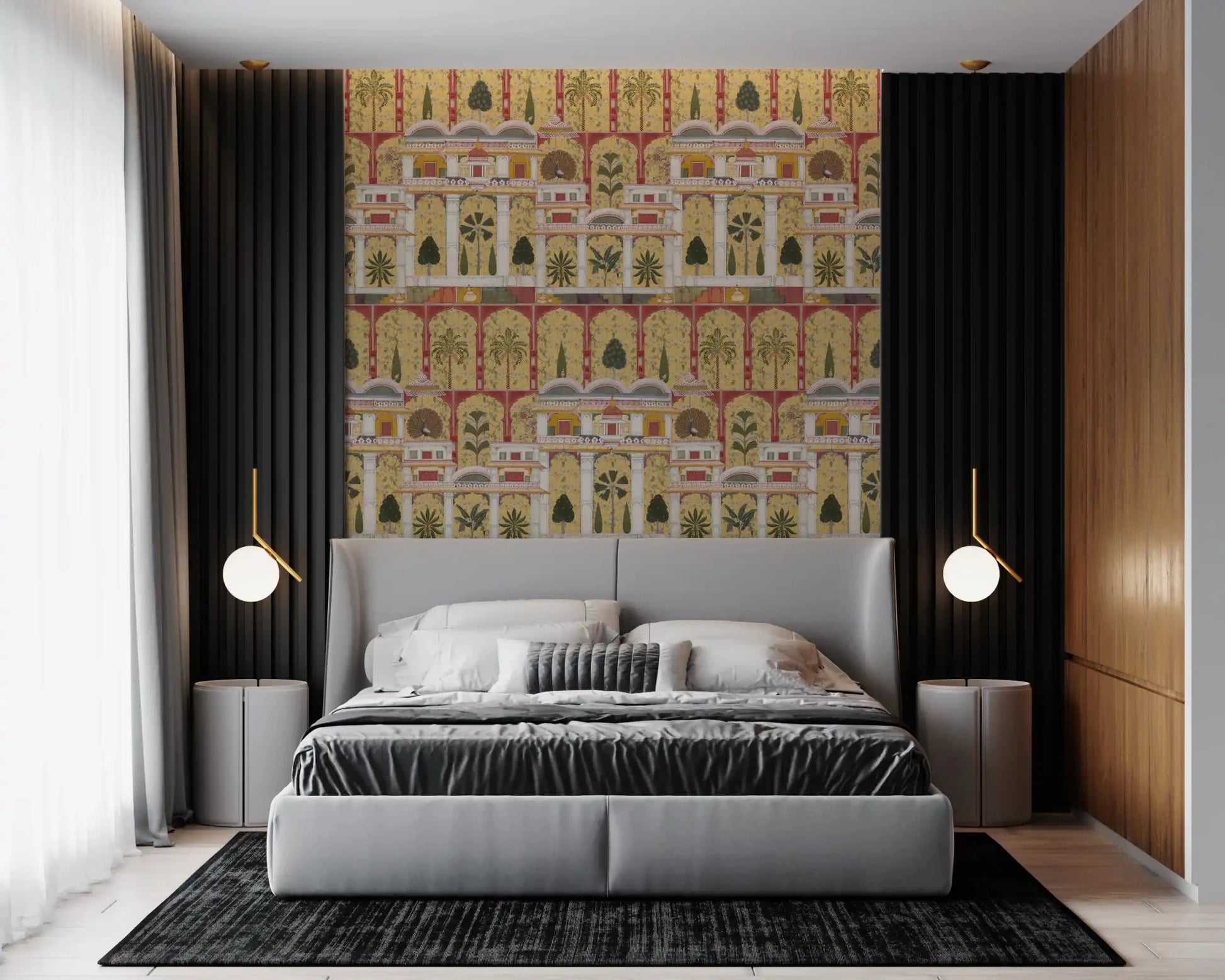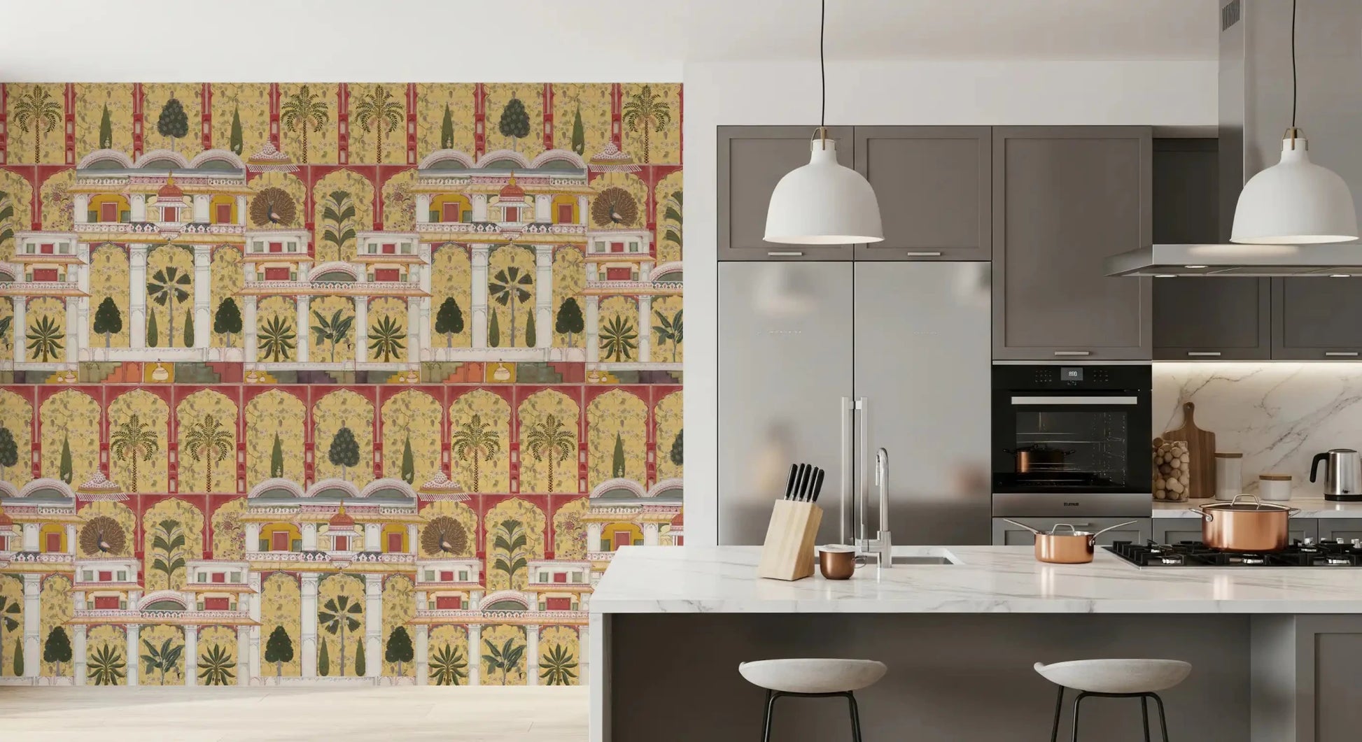 Forvandl din stue med dette udsøgte vægtapet, der har en betagende gengivelse af en traditionel indisk paladshave. Dette fængslende design fremviser et indviklet gentagende mønster af store arkitektoniske buer, frodige palmer, eksotiske bananplanter og elegante påfugle, alt sammen gengivet i den tidløse stil af miniaturemalerier. Den rige farvepalet kombinerer varme gyldne gule og dybe rødbrune nuancer med grønne, cremehvide farver og antydninger af orange, hvilket fremkalder en følelse af historisk storhed. Denne luksuriøse vægdekoration skaber et majestætisk fokuspunkt, perfekt til en sofistikeret stue, en overdådig spisestue eller en dramatisk entré. Det detaljerede kunstværk bringer kulturel dybde og en fortryllende atmosfære til ethvert interiør.