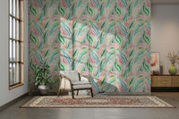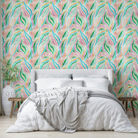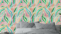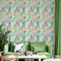 Omfavne levende bohemsk stil med dette fængslende tapet. Dette design er en legende vri på klassiske zebra-striber, og har et kalejdoskop af pastel- og juveltoner-tænk turkis, smaragdgrøn, bløde pink og varme appelsiner-alle gengivet i en struktureret, håndmalet stil. Den subtile nødlidende baggrund tilføjer dybde og et strejf af vintage charme, der perfekt supplerer de flydende, organiske linjer i det flerfarvede zebramønster. Dette tapet fremkalder en følelse af ubekymret energi og ubesværet chic, ideel til at tilføje en pop af personlighed til ethvert rum. Det er en unik blanding af vilde dyreprint og afslappet Boho-æstetik, der tilbyder en frisk og moderne overtagelse af et tidløst mønster.