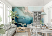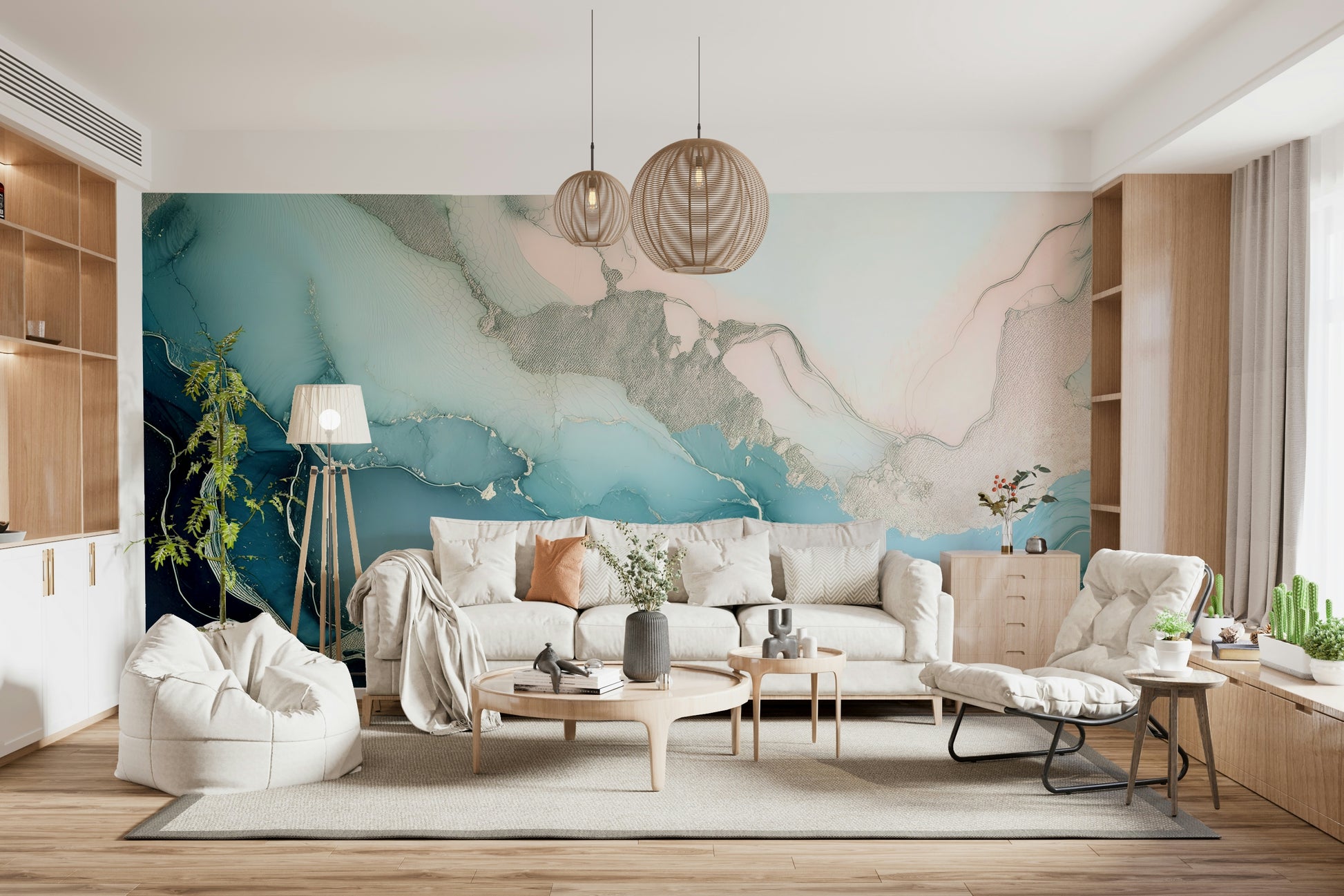 Immerse yourself in the serene beauty of this azure abstract. The design features flowing lines and a delicate color palette of blues, whites, and subtle pinks, accented with shimmering silver. This sophisticated pattern brings a calming presence to any room. Install this wallpaper for walls in living rooms, bedrooms, or even home offices to create a tranquil atmosphere. Its fluid design and soft hues easily match with modern or minimalist interiors, adding a touch of artistic elegance and visual interest.