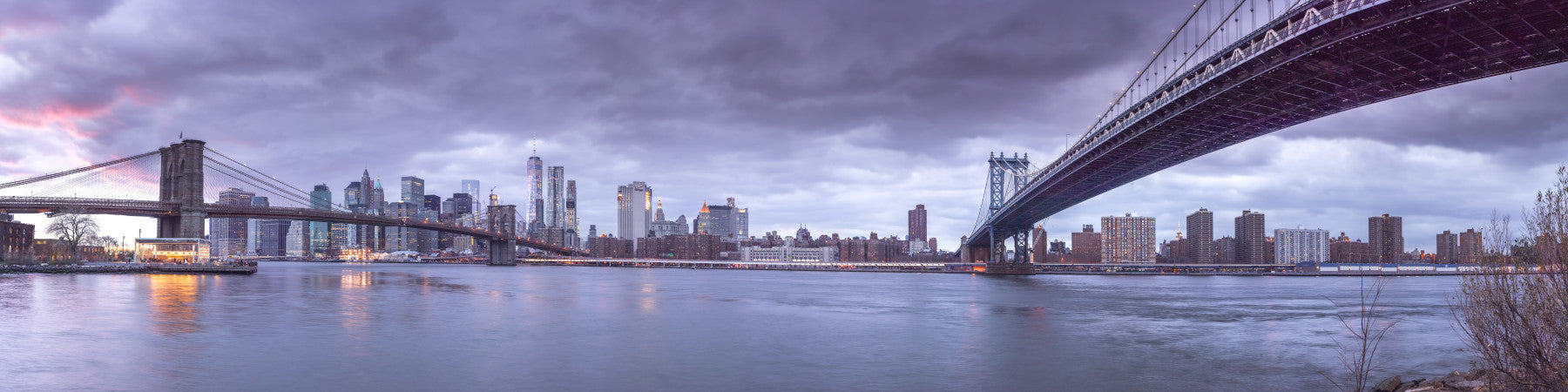 Brooklyn Bridge and Manhattan Bridge over East river, New York. Capture the urban magic with this breathtaking cityscape. The image presents a wide panorama of New York City's iconic bridges meeting the towering skyline under a twilight sky. The tranquil water reflects the city lights, adding depth and allure. The calming hues offer a peaceful ambiance, making it perfect for bedrooms or offices. Use this wallpaper for walls to infuse modern homes with a touch of big city splendor. It perfectly suits a living room or study.