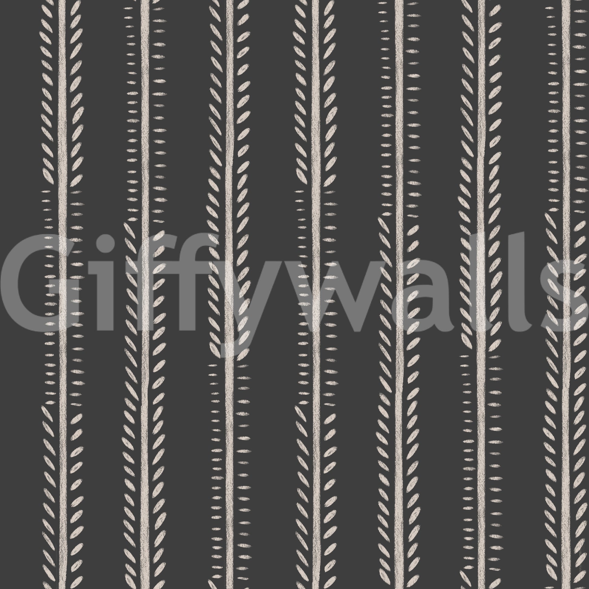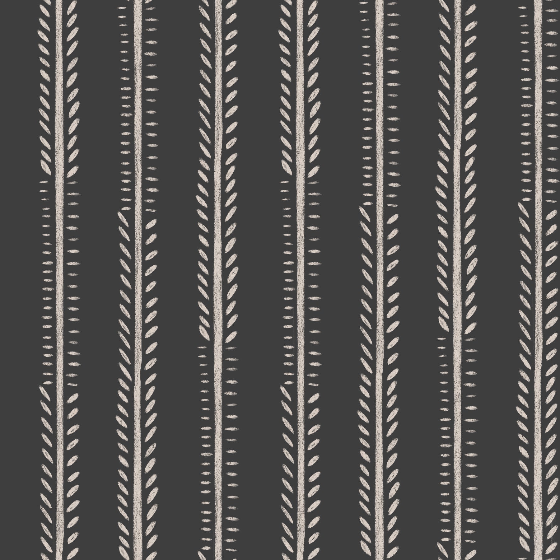 Nocturne Stripes tilbyder et sofistikeret og beroligende tapetdesign. De lodrette striber i en mørk kulgrå punkteres af delikate, off-white bladlignende former, der skaber et subtilt, men alligevel visuelt slående mønster. Den håndtegnede fornemmelse og let strukturerede udseende tilføjer varme og karakter, der ligner en unik kridt eller malingseffekt. Dette alsidige tapet er perfekt til at skabe en rolig atmosfære i soveværelser, stuer eller gange. Det blander problemfrit moderne æstetik med et strejf af stille elegance, der giver et jordforbindelse og afslappende baggrund for ethvert rum.