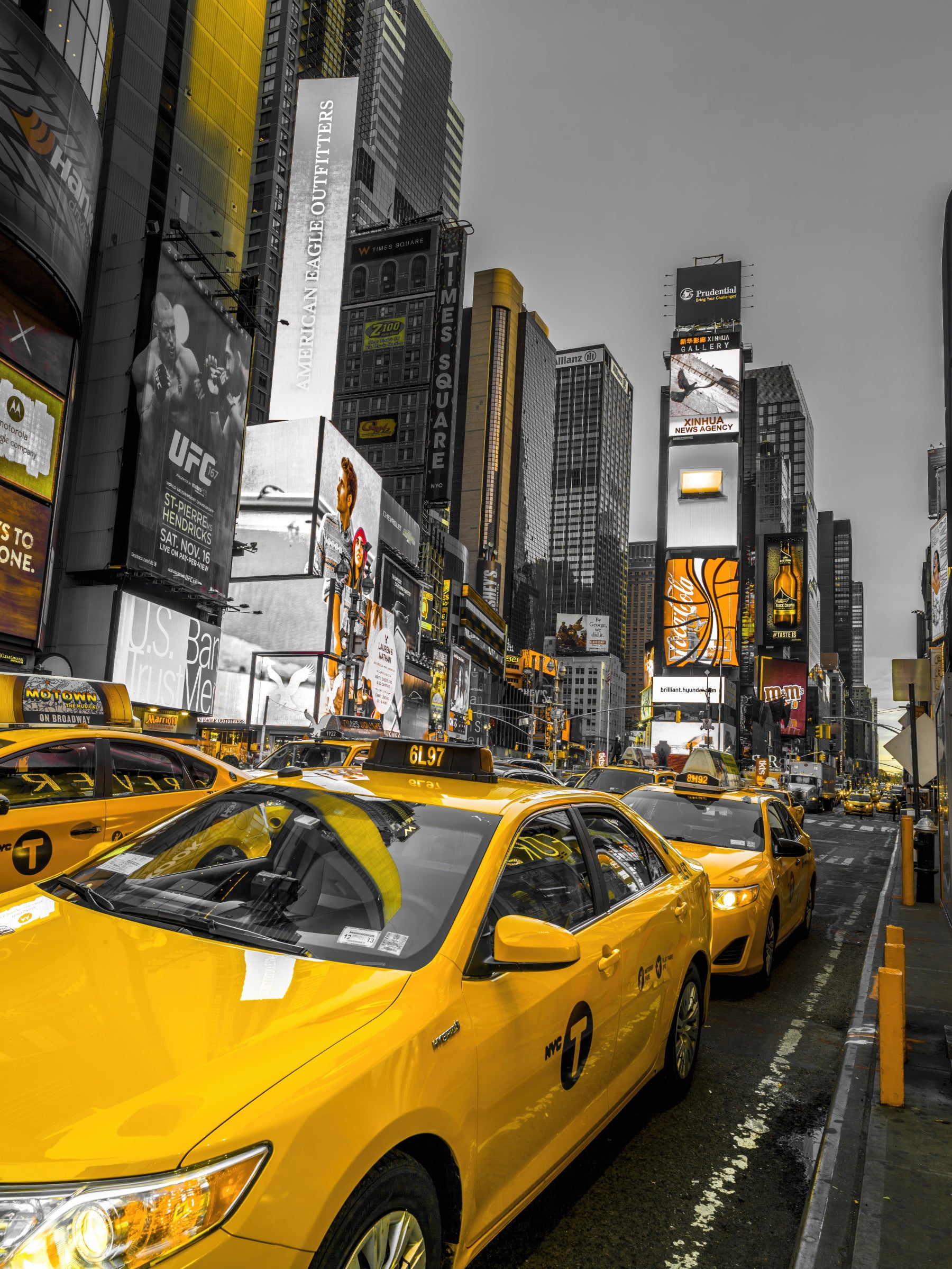 Times Square art: NYC Cabs Golden Rush selective color street photograph.