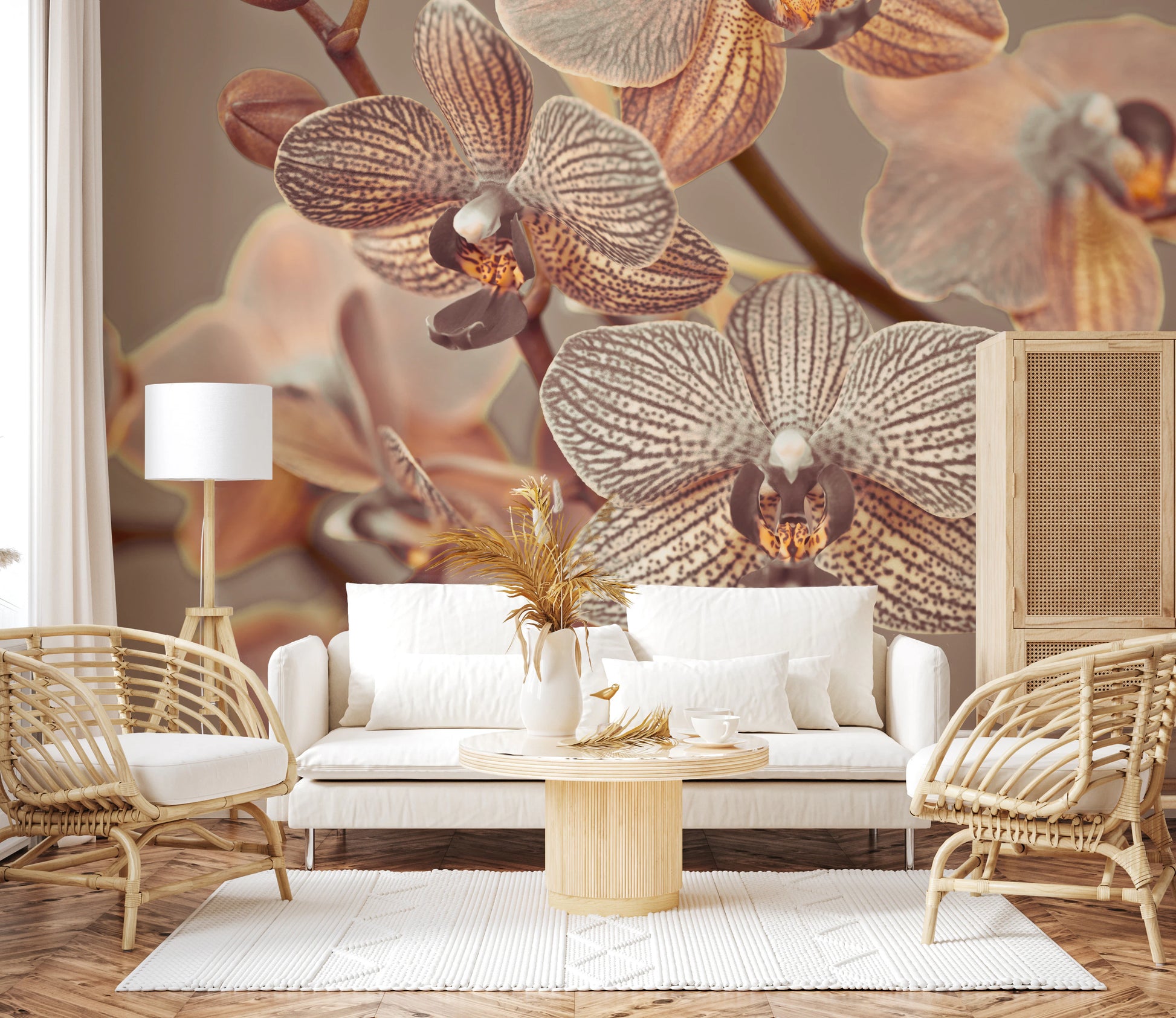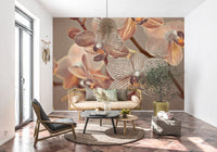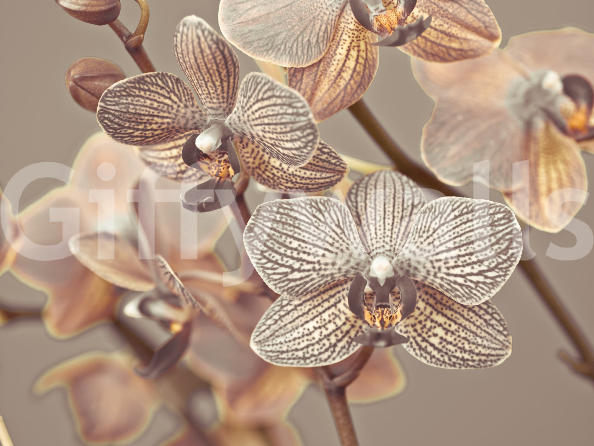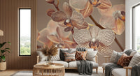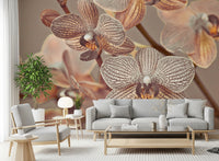 Nærbillede af orkideer. Introducer et strejf af underspillet elegance med dette yndefulde blomstertapet til vægge. De subtile mønstre og bløde sepia-toner bringer en beroligende tilstedeværelse til ethvert rum. Nærbillede af orkideer skaber en intim og indbydende atmosfære. Detaljerne i blomsterne, med delikate striber og teksturer, giver dybde og visuel interesse. Den neutrale farvepalet lader designet fungere godt i soveværelser, gange eller opholdsrum. Forvandl dine vægge til et botanisk udstillingsvindue, der fremhæver ro og stil. Dette design integreres ubesværet med en bred vifte af indretningsstil.