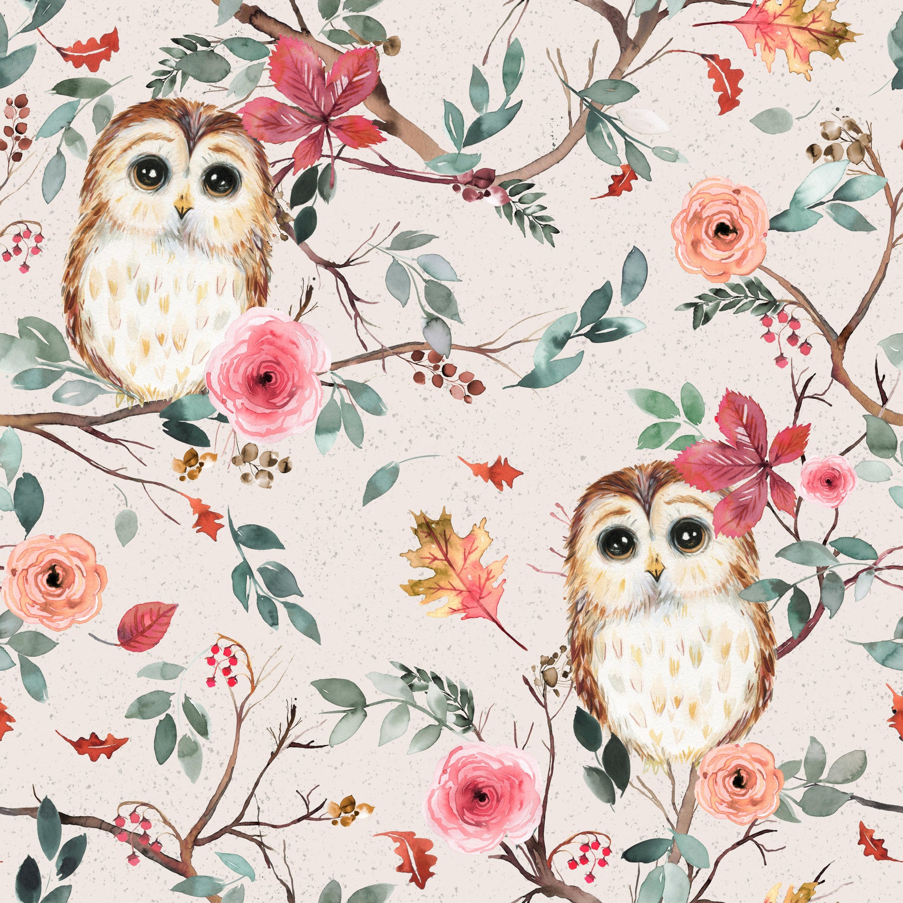 Omfavne ro med dette fortryllende tapet med to yndig ugler beliggende blandt en pulserende høstlig scene. Delikate akvarelroser i bløde pink og ferskner blomstrer sammen med frodige grønne blade og rigt rødt løv, hvilket skaber en harmonisk blanding af farver. Uglerne, der er gengivet med udsøgt detalje, forekommer roligt ligger på grene, udstråler en følelse af rolig og fredelig sameksistens med naturen. Dette design tilbyder en beroligende flugt, perfekt til at skabe en afslappende atmosfære i ethvert digitalt rum. Den subtile beige baggrund forbedrer den samlede rolige og indbydende humør.