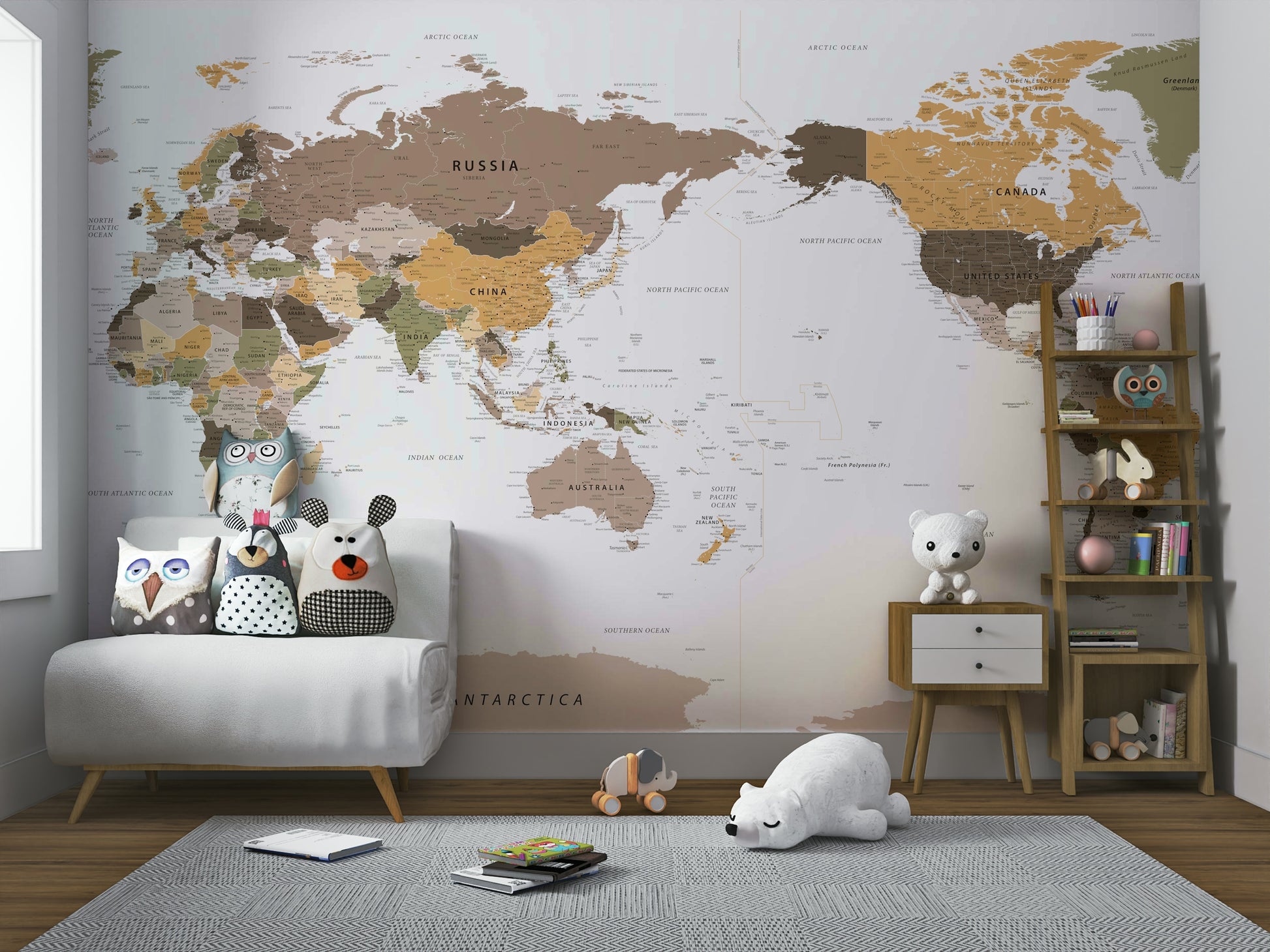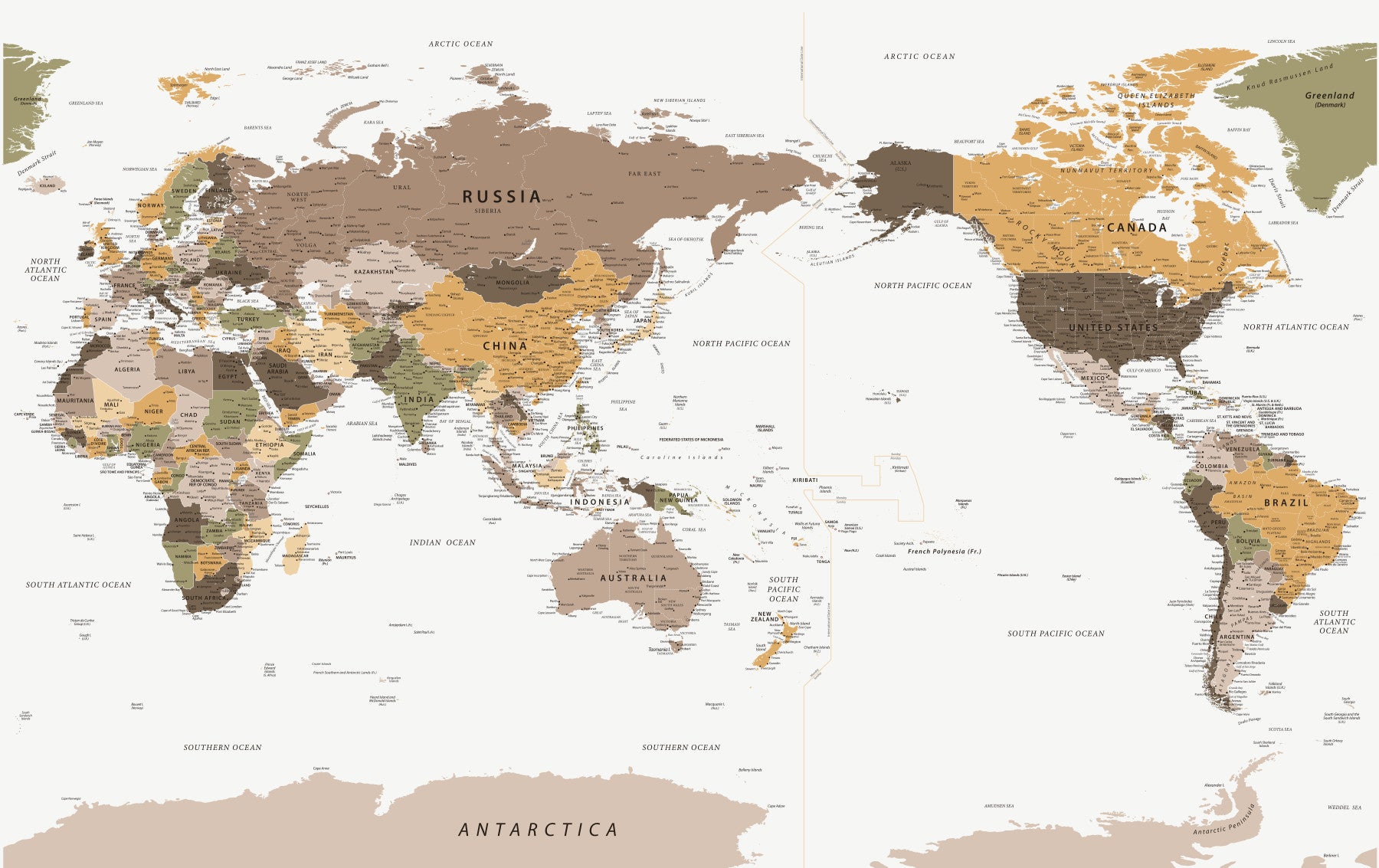 Gå på en visuel rejse med denne fantastiske Pacific-centrerede verdenskort tapet. Rige jordfarver fremhæver kontinenter i en fængslende vintage -stil og trækker øjet til den enorme vidde af Stillehavet. Detaljerede landegrænser og bymarkører inviterer til udforskning og fremmer en følelse af vandrende og globalt eventyr. Dette omhyggeligt udformede kort tilbyder et unikt perspektiv, perfekt til rejseentusiaster og enhver, der værdsætter smukt, informativt design. Den beroligende farvepalet skaber en rolig atmosfære, hvilket gør den til en ideel tilføjelse til ethvert arbejdsområde eller hjemmekontor.