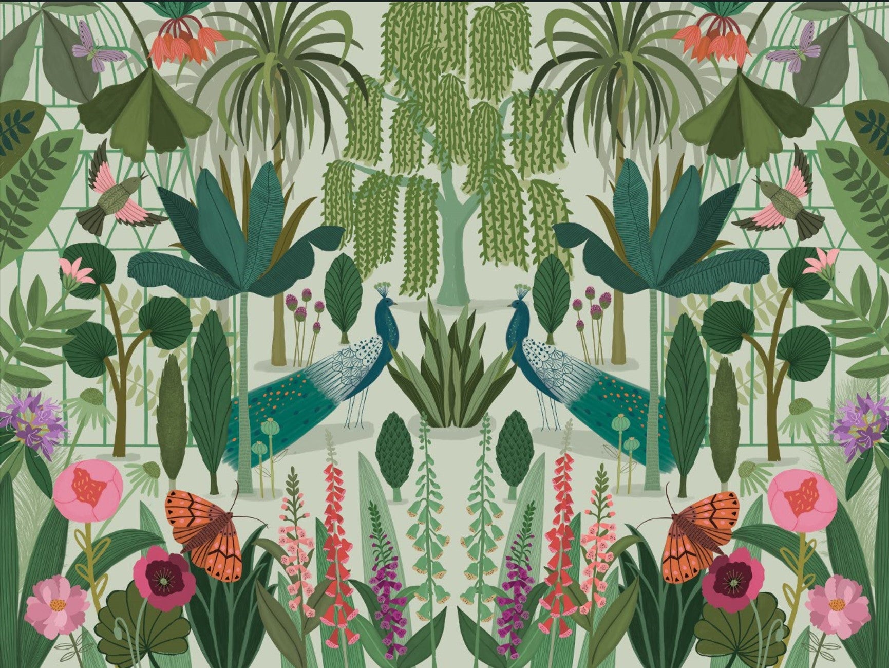 Flygt til en fredfyldt parisisk park med dette fortryllende tapet. To majestætiske påfugle står stolt midt i et levende tapet af frodig tropisk løv, sarte blomster og flagrende sommerfugle og kolibrier. Kunstværket fremkalder en følelse af ro og skønhed og indfanger essensen af en skjult, omhyggeligt kurateret have. Bløde grønne og dæmpede lyserøde farver skaber en beroligende atmosfære, mens de detaljerede botaniske illustrationer fremviser den rigdom af parisisk flora. Dette design er perfekt til at tilføje et strejf af sofistikeret natur til ethvert rum.